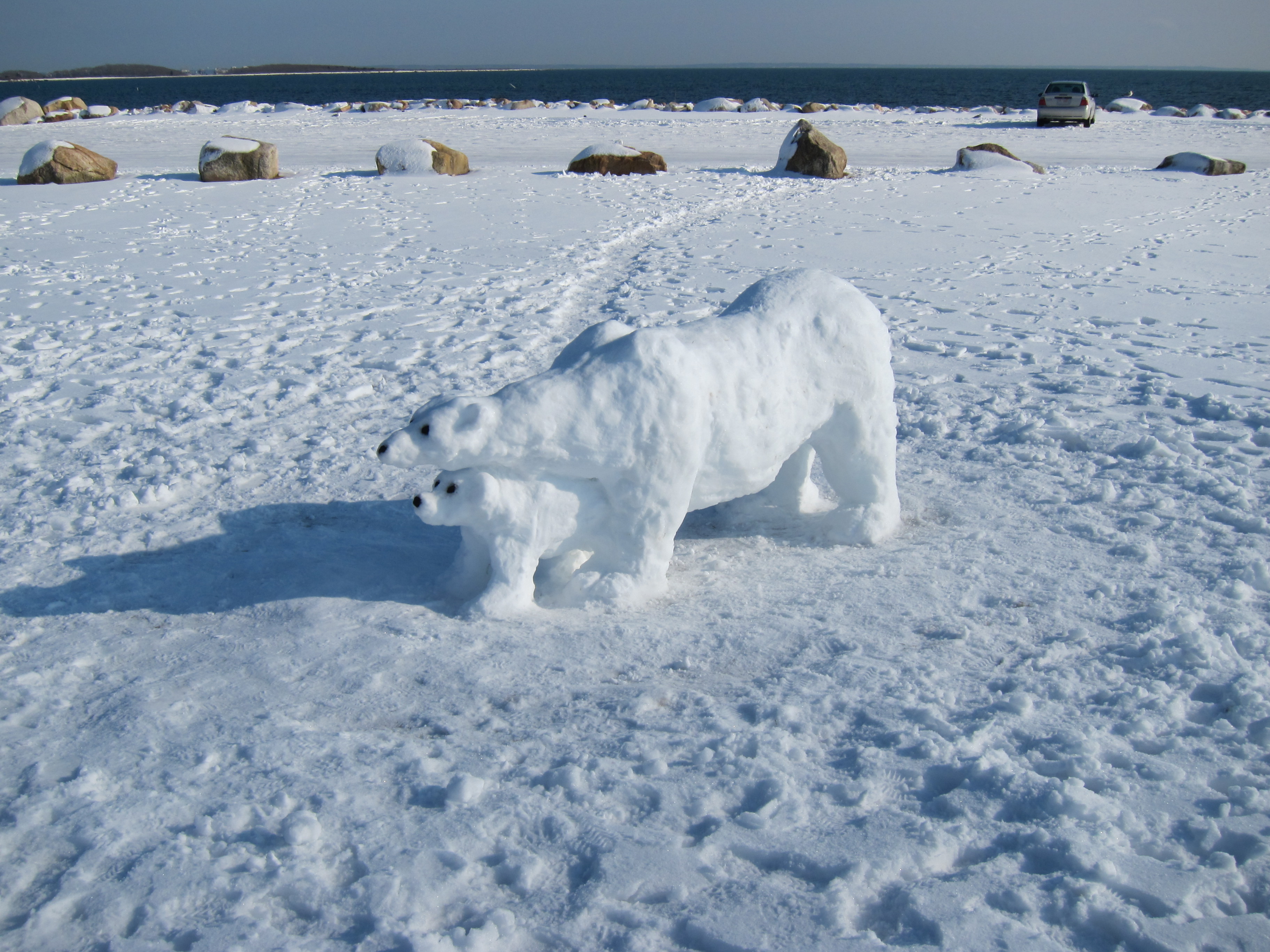 For some reason Phoebe was not enthusiastic about the snowsuit.  However she did enjoy getting pulled around on the sled and getting out in the snow.  I am not sure who has time for such snow sculptures but the work is pretty impressive and cute as well, assuming this represents a mother and cub.