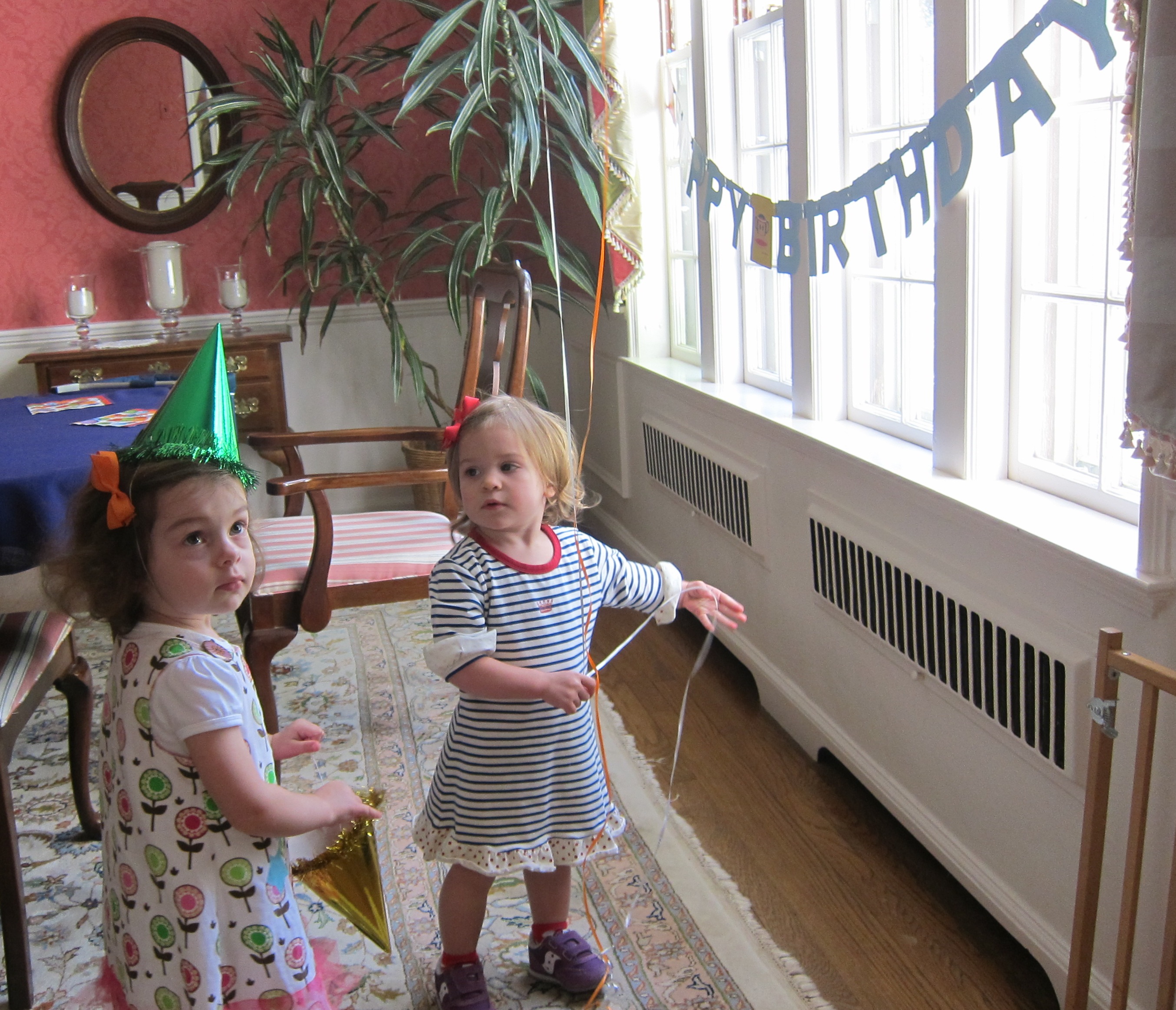 Above: Phoebe refuses to share balloons with Olive. She has this trait in common with many of the captains of industry. Of course it is likely that her entire outfit was once worn by her cousins. Below: You might imagine Poppi is wishing for some peace and quiet on his birthday, but it is quite clear that he thrives on the chaos.