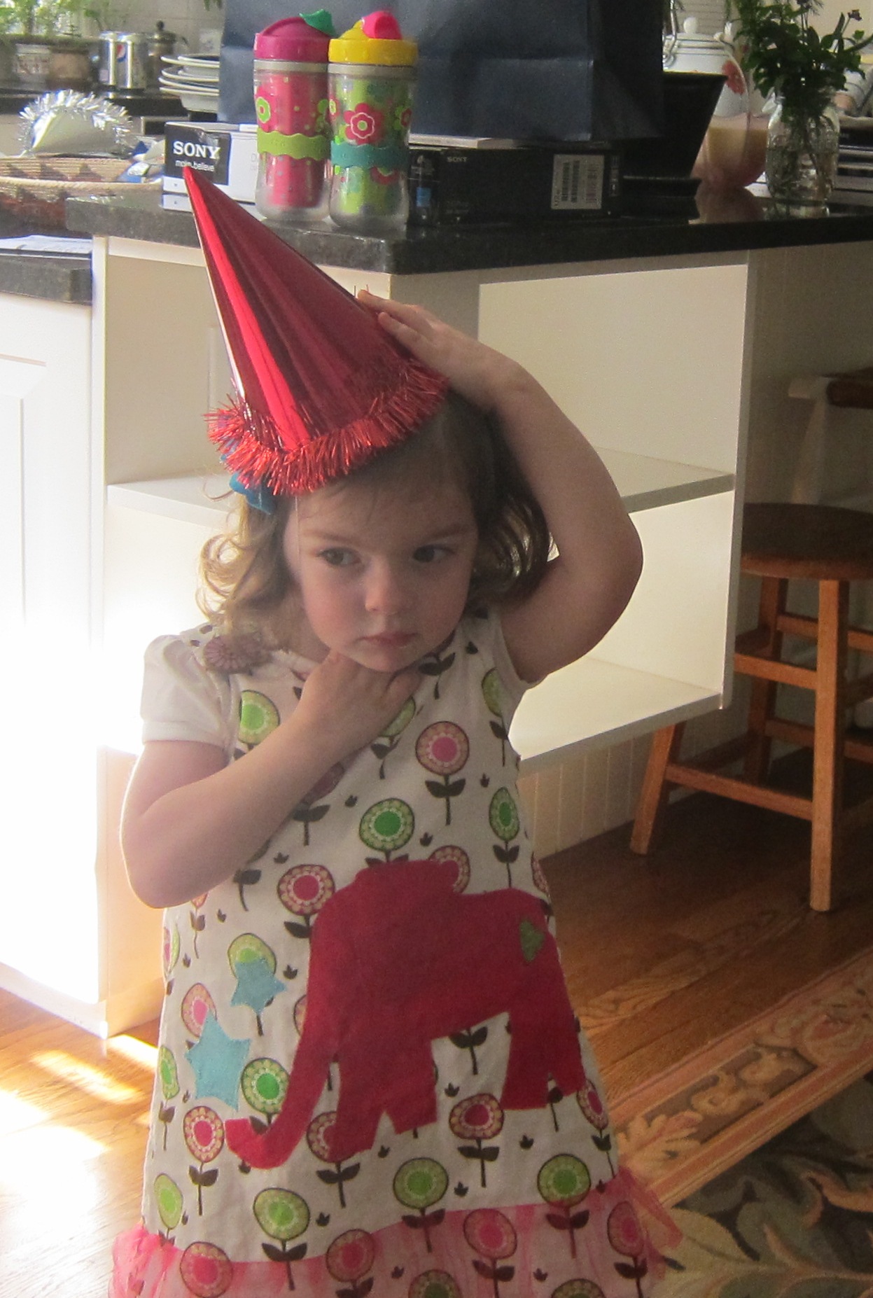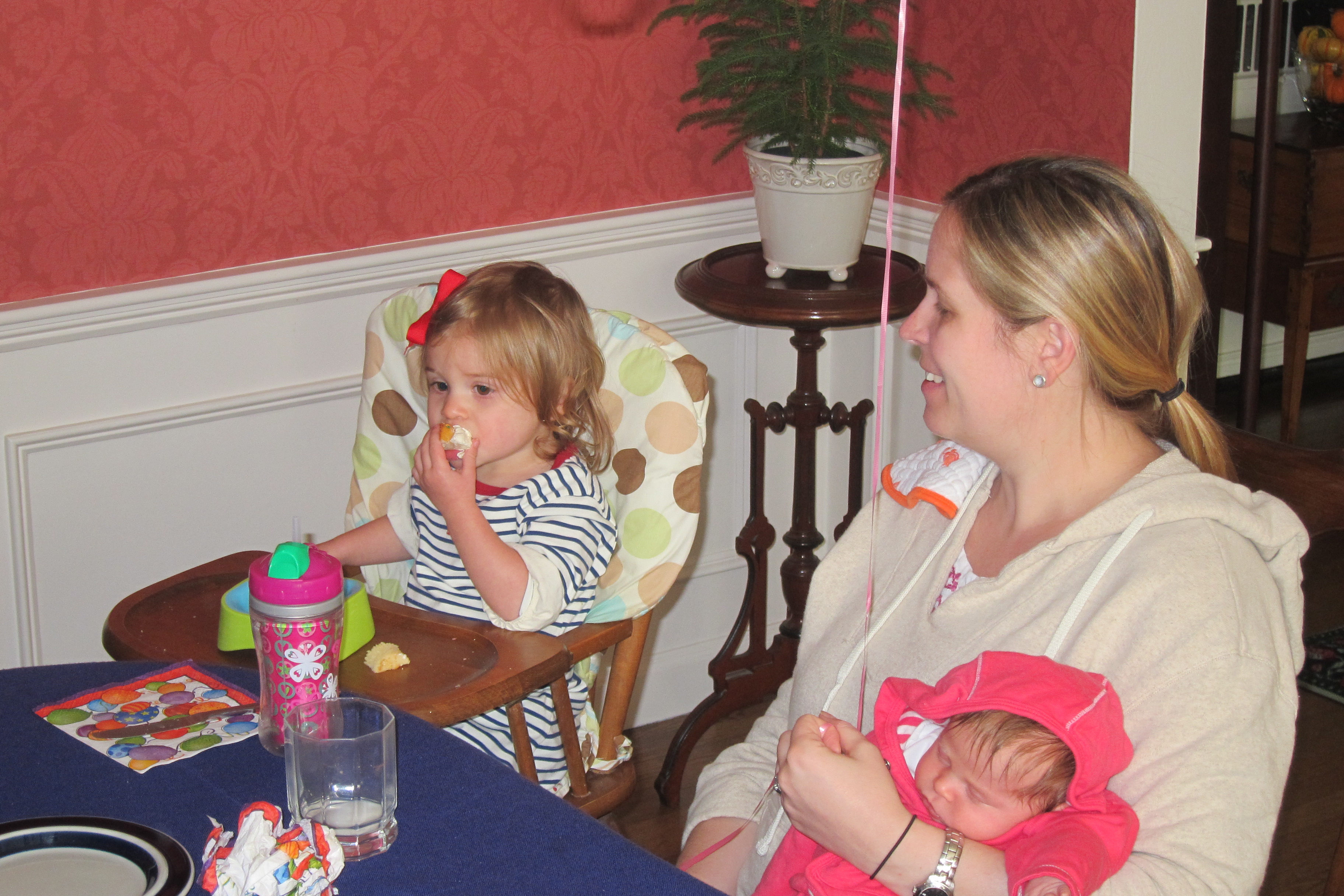 Above: Lindsay adjusts her hat, unaware that a child roughly her age has sewn an inappropriately sized elephant in a skewed position on her dress. Phoebe demolishes a cupcake to fuel up for a solid nap while Ellie hangs out in second child position.