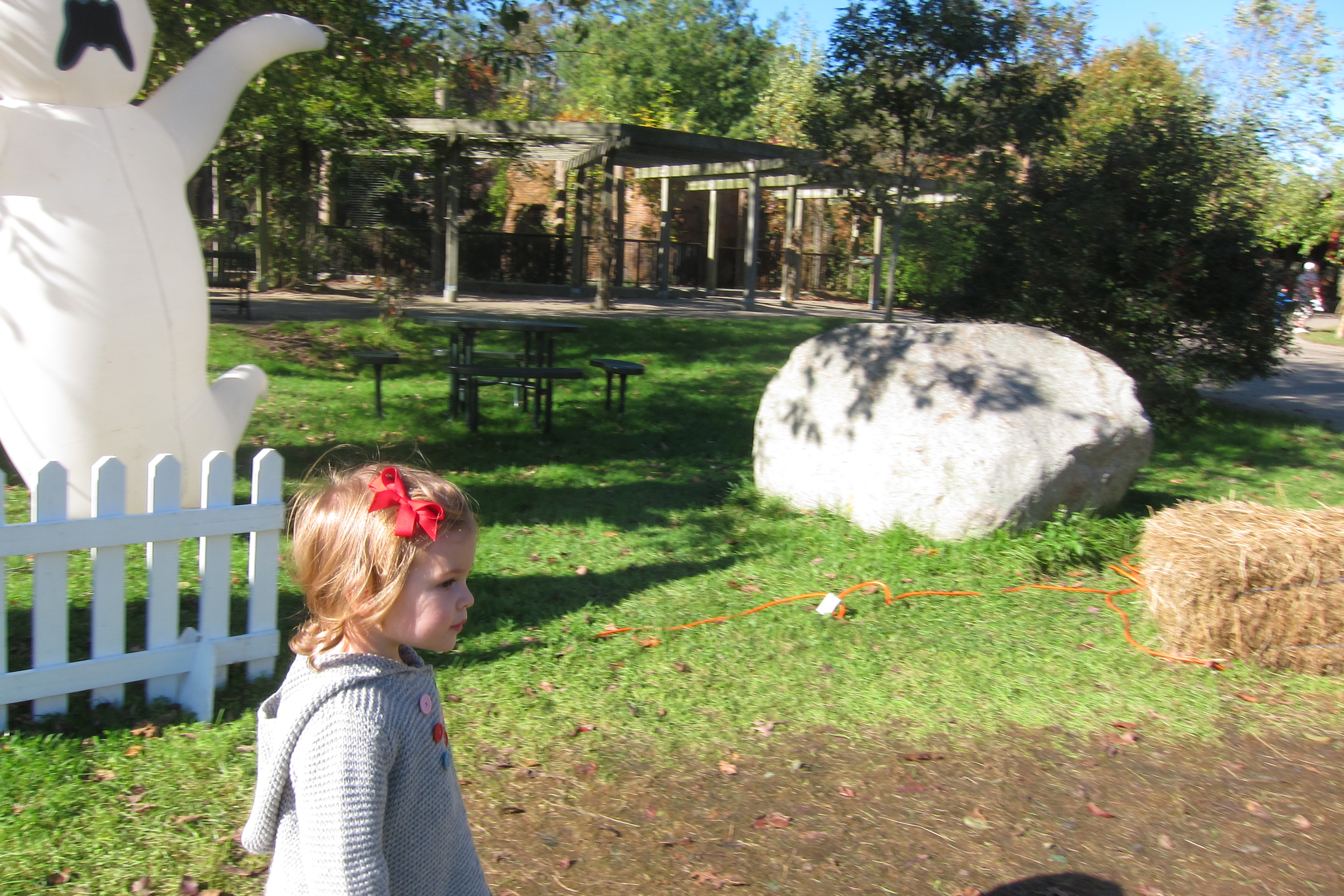 An unseasonally beautiful weekend meant we could spend significant time outdoors. Saturday Gaga and I took Phoebe to the Buttonwood Park Zoo which featured a plethora of inflatable decorations for their nighttime halloween strolls. Needless to say Phoebe had no interest in any of the animals and was much more focused on the ghosts, which she pronounces “ghoshts” (long o) in the manner of Humphrey Bogart (or more accurately Peter Brady as Humphrey Bogart). Her obsession with ghosts has not risen to the level of her cousin Lindsay who believes that the shower at Tootsie and Poppi’s house is haunted. While this is entertaining, it is also the premise of several recent horror movies, none of which ended well for the adults. Sunday I took Phoebe back to the Silverbrook Farm in Acushnet. She was a bit under the weather so we spent considerable time on the hayride. Watching people deal with the rather violent motions of a tractor-pulled wagon is quite entertaining.
