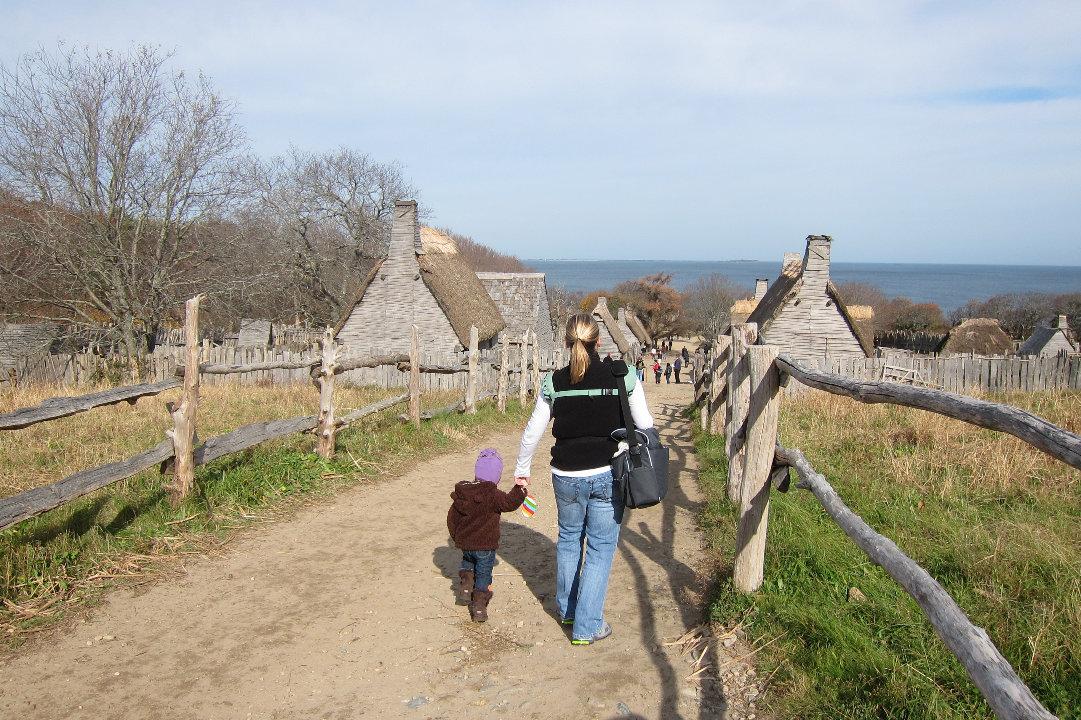 We had originally intended to go to the Roger Williams Zoo but decided instead to go to Ply(i)mo(u)th Plantation.  Since our last visit in 2004, the Wampanoag village has expanded and there appears to be a new gift shop near the head of the village.  There were lots of out of state license plates in the parking lot and several tour groups from asia who seemed confused as to why anything in the +0 C.E. was considered historical.   We were informed by several of the roll playing newcomers that there was a Phoebe in the village although there was some disagreement at the age of this Phoebe in 1627 and whether she was a Hicks or a Harding.  Phoebe seemed most excited about seeing the animals, collecting rocks,  and falling on her face.  She seems to have difficulty controlling speed on steep downhills.   This led to a couple of spectacular superman style spills.  Ellie enjoyed her lunch inside the meeting house/fort.  Following the visit to the 17th century we picked up lunch at the Little Red Smokehouse.  They offer food comas to go.