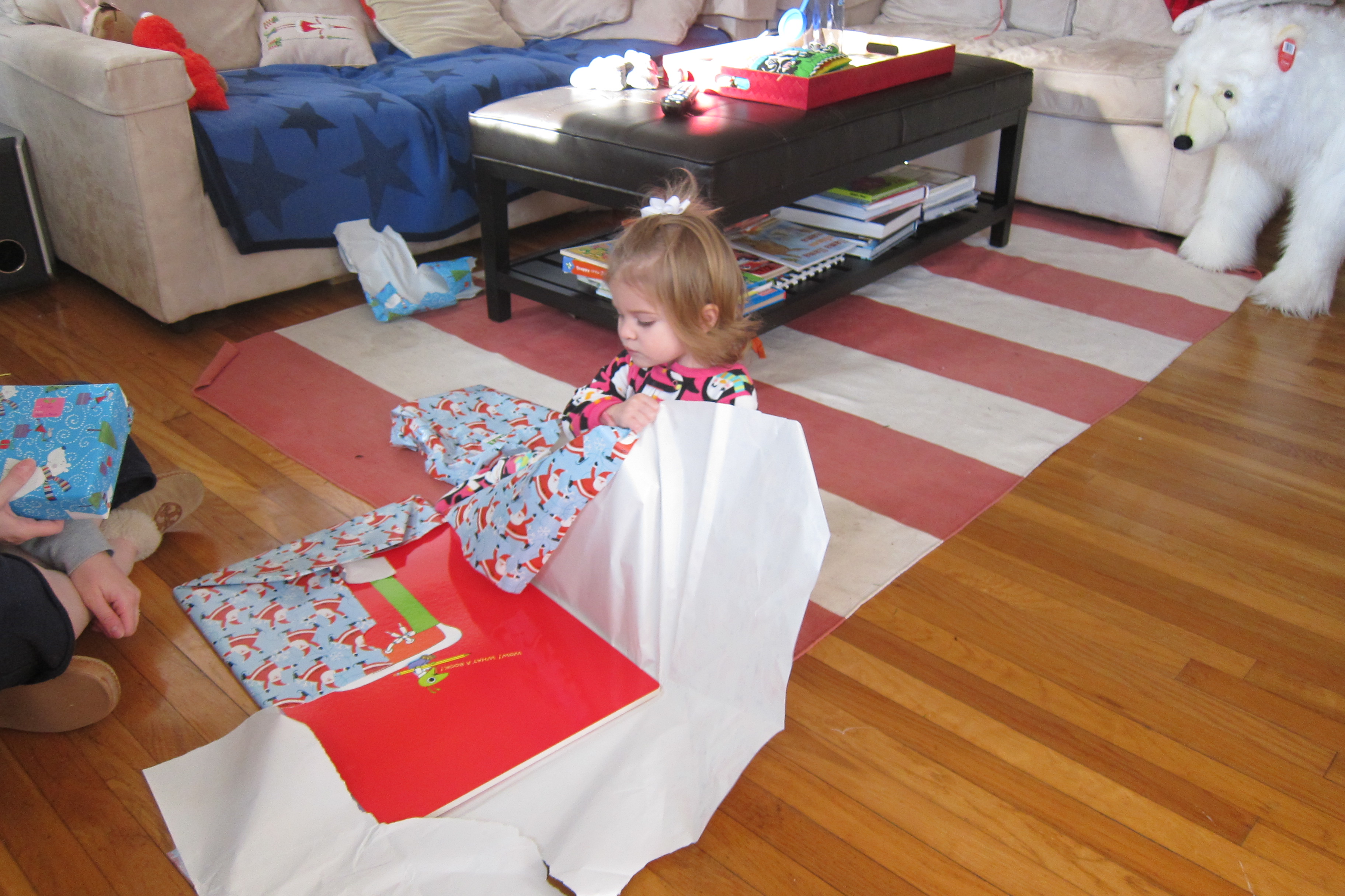 Above: Ellie sported her one-time use outfit. You might be thinking that it is extremely unlikely that I purchased that. You would be correct. Below: Phoebe unwraps her Richard Scary “biggest book ever”, a title that is probably not justified but boldly stated in the manner of the MLB’s “World Series” or bodybuilding’s Mr. Universe. Based on what I have seen on the SciFy network, it is quite likely that if an alien were arrive on our planet it would be considerably stronger than Arnold in his prime. Regarding the world series, the MLB should just feel fortunate that the countries that field strong athletes don’t (rightfully so) care about baseball.