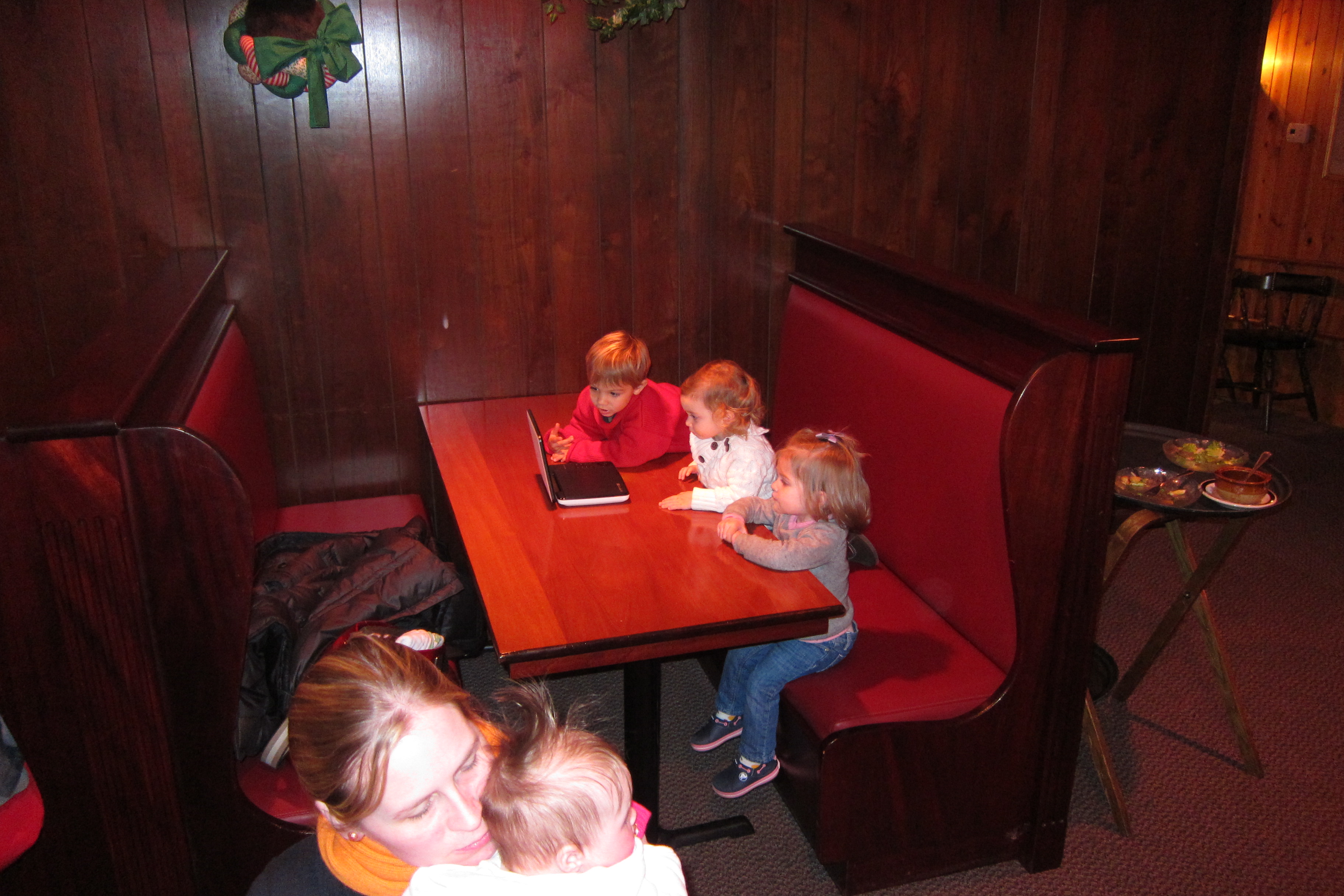 Gaga’s birthday is the 23rd of December, but she rarely gets to celebrate on the actual day. She was willing to wait until the 29th and her patience paid off. Jon managed to finagle a private room at her favorite restaurant, Pates, and brought along a video of Frosty so we could actually sit and eat beyond the 7 minute timeframe in which it is possible to keep three toddlers simultaneously in their seats. Jake provided Phoebe with ketchup and did his best to calmly inform her that she already had plenty when she put in her usual request for ‘more sauce’.