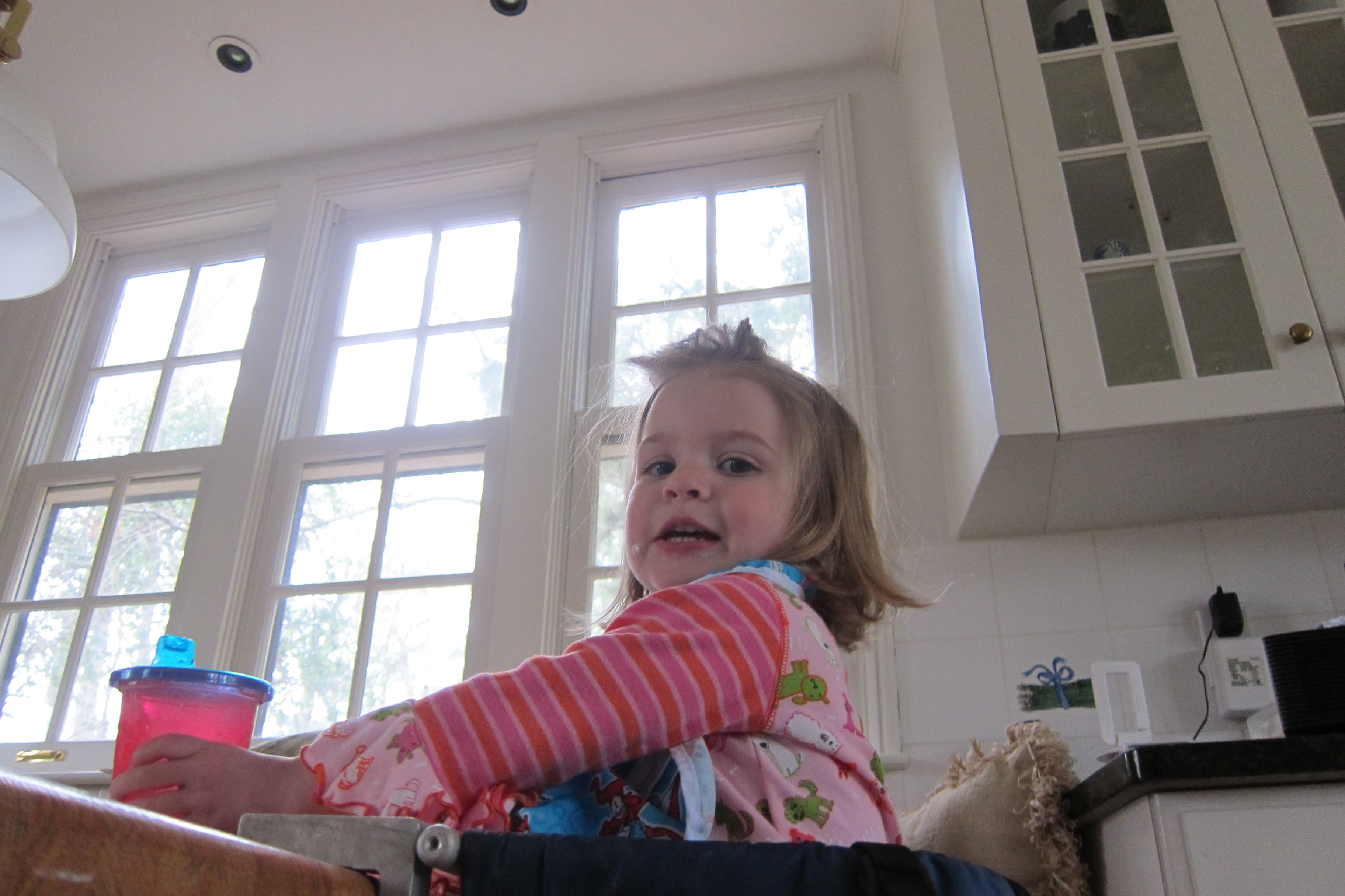 Above: Phoebe enjoys lunch at Tootsie’s table. I had more or less promised her that the Mo was going to make pigs in a blanket but instead we had yummy subs. Below: Ellie’s short lived “stranger” phase seems to be over. She might look a bit like her father but she already has better social skills.