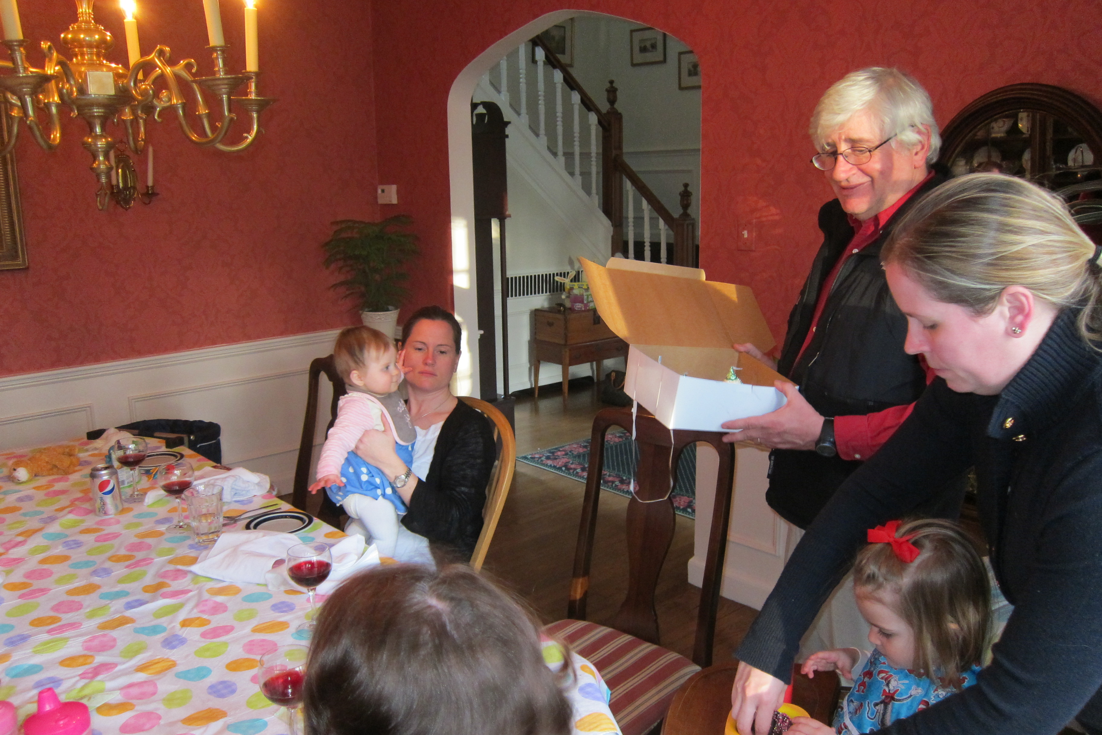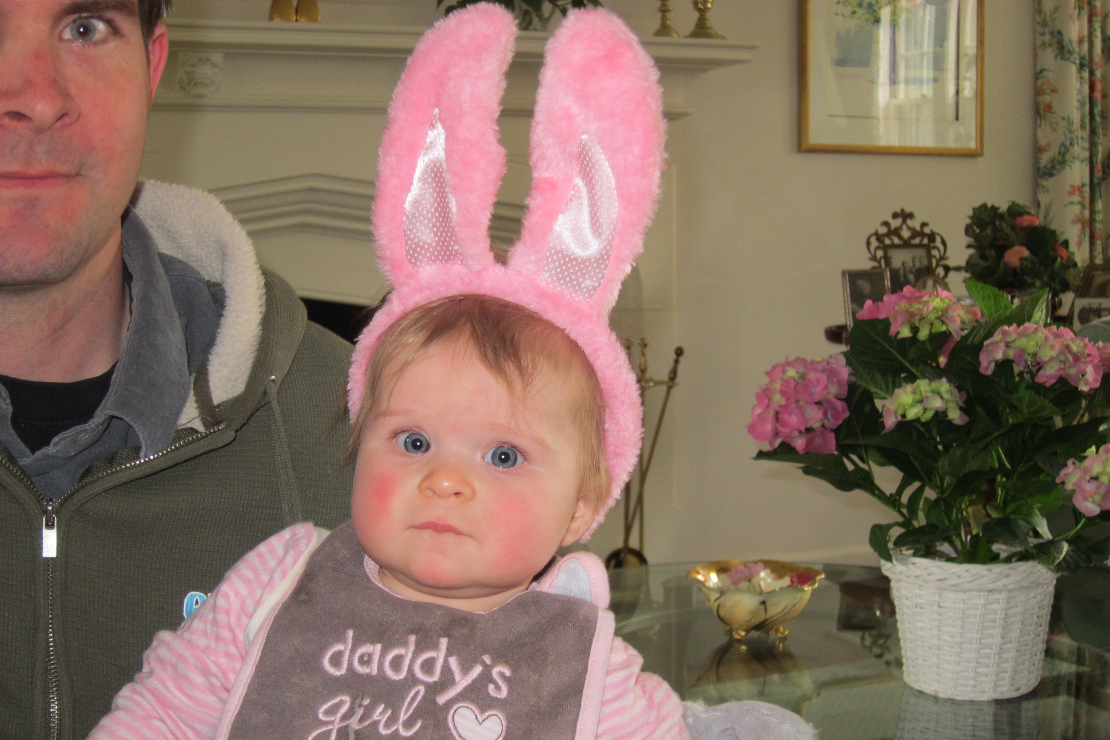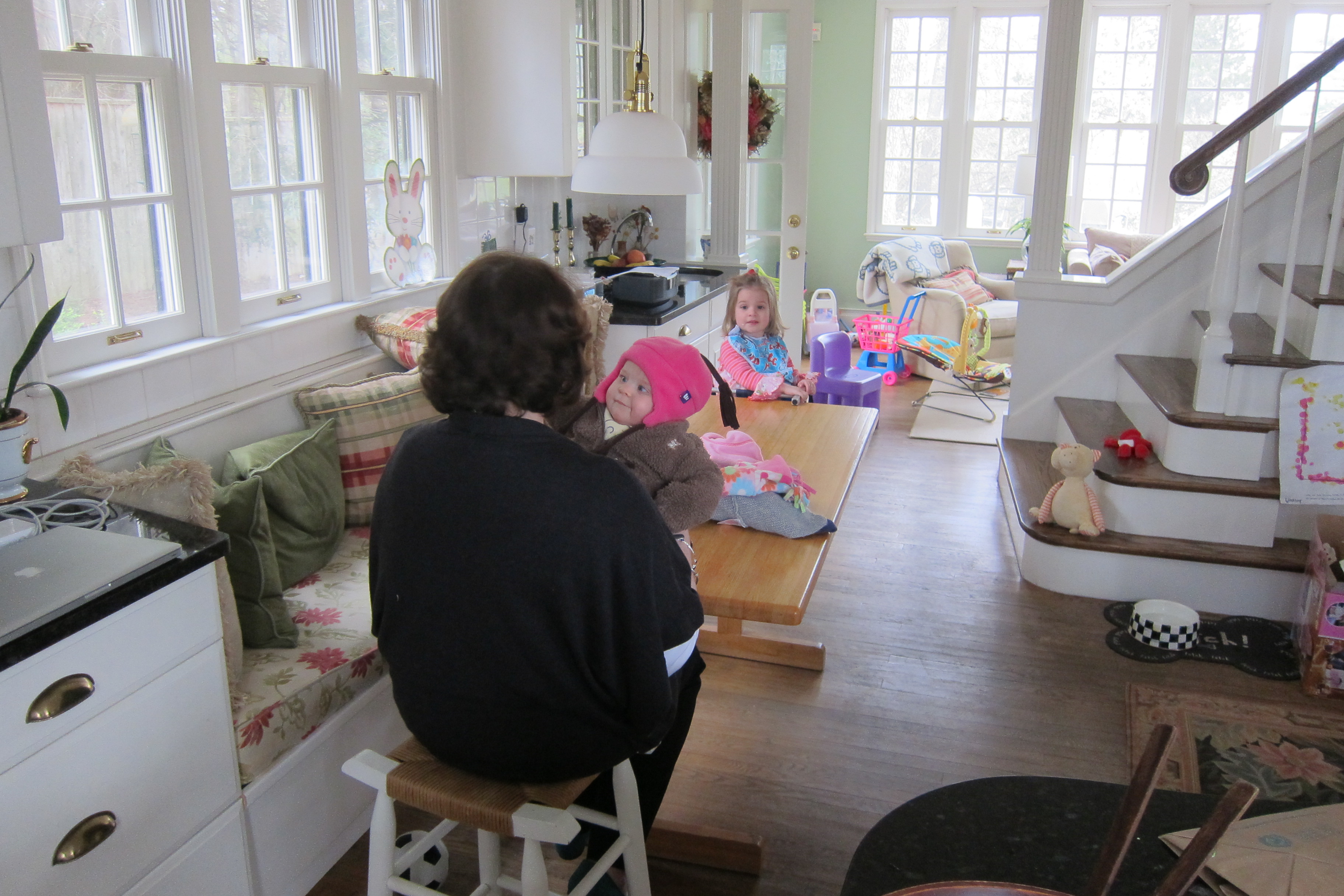 Easter at the Howley household with all present. A tiring, but fun day which included a trip home with a seat-kicking 2 year old who kept shrieking “Sssh, the baby is sleeping”. Ellie fell asleep on the way home to the playground so she got a 1.5 hour walk around Wellesley hills and rosy cheeks, courtesy of her dad. This was fine with me since it left Cristin to turbotax our annual filings with Uncle Sam. Poppi managed to boost our return by $1000 with a few questions on details which Cristin had shrugged off.