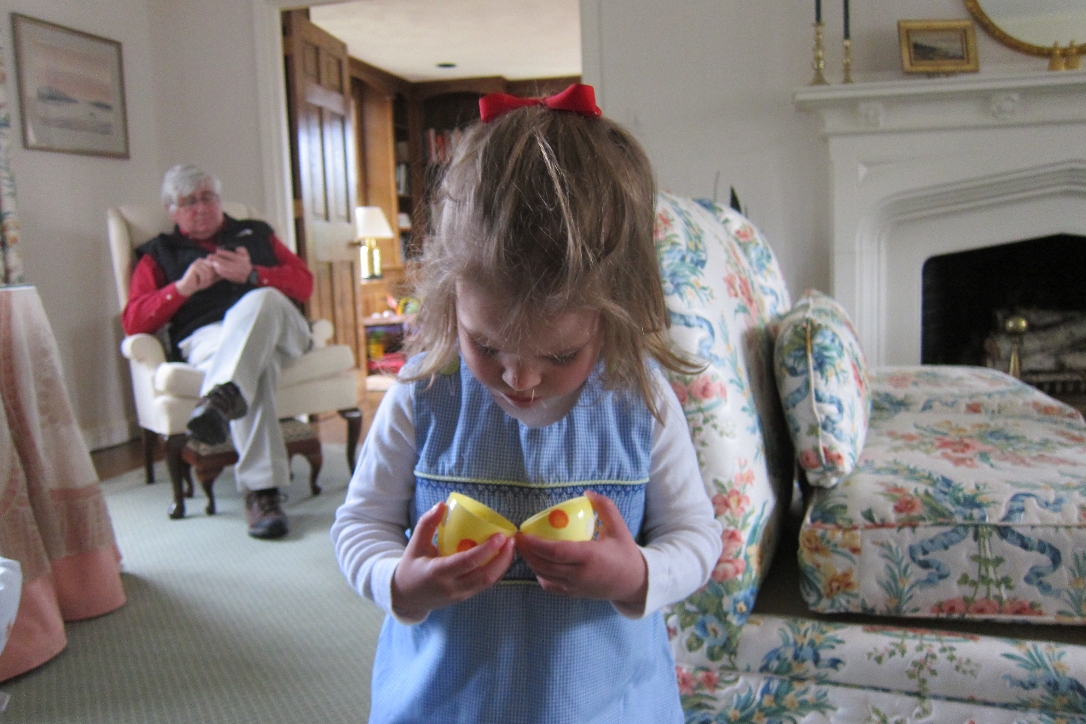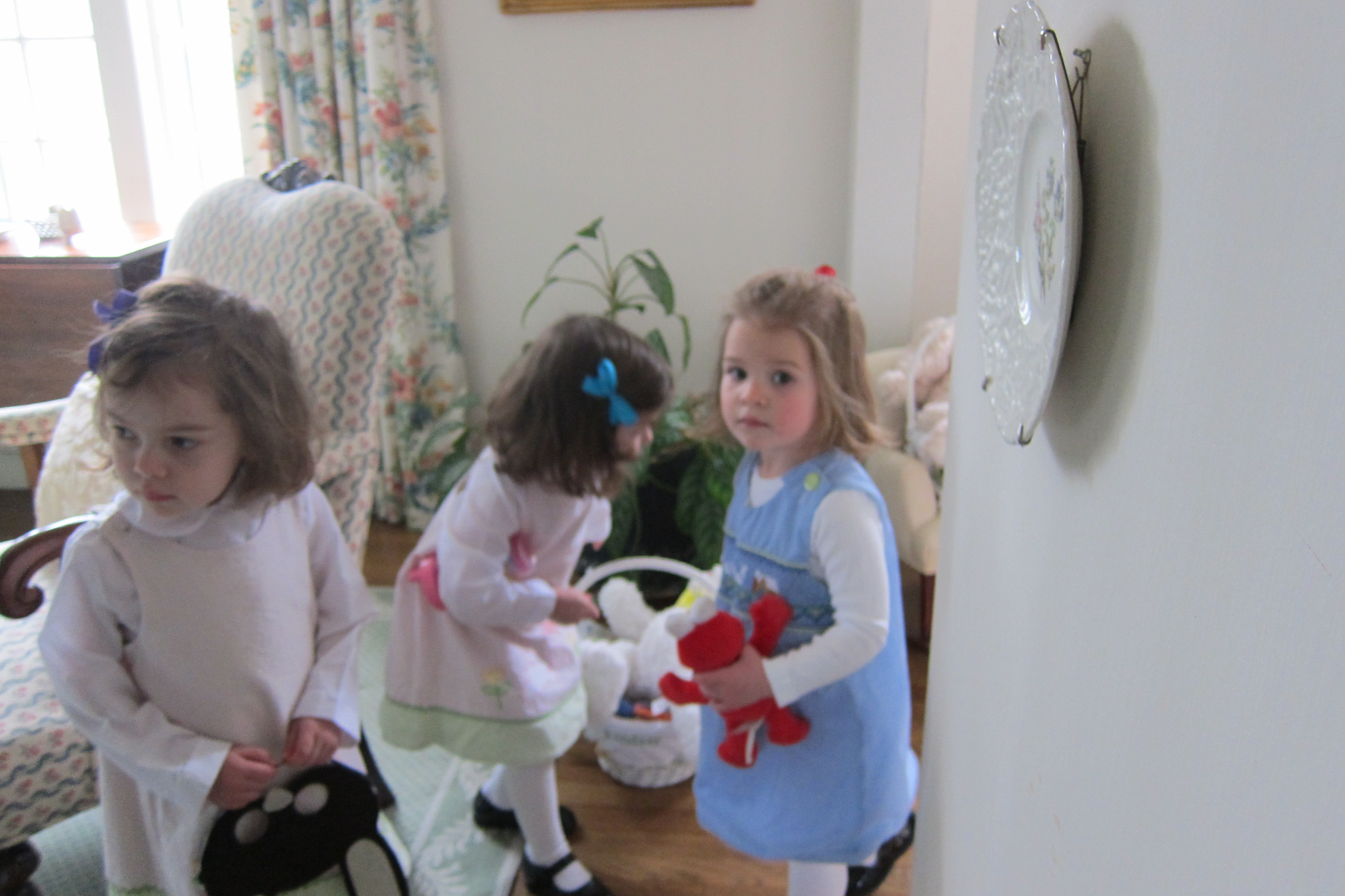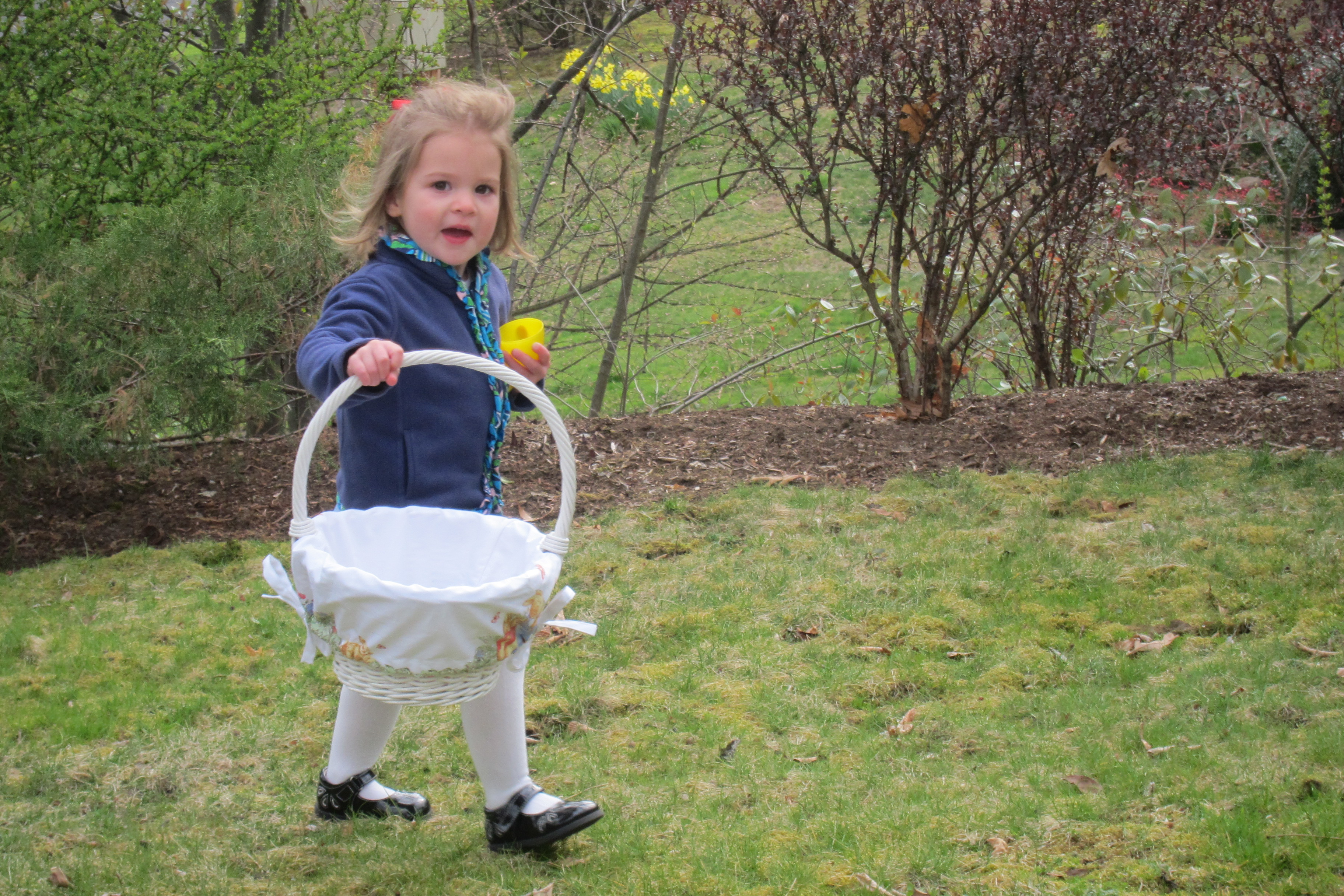 Above: Phoebe likes to tell me that “there is a baby in there” when she sees an egg. Here she discovers that the only thing inside the egg is the soul of the chinese factory worker who works 80 hour weeks making these things. Below: Lindsay left everybody in the dust at the start of the easter egg hunt but Phoebe caught on quickly. It didn’t matter much how many eggs were collected during the hunt as there were a number of illicit inter-basket transfers that occurred once they had returned to the house.