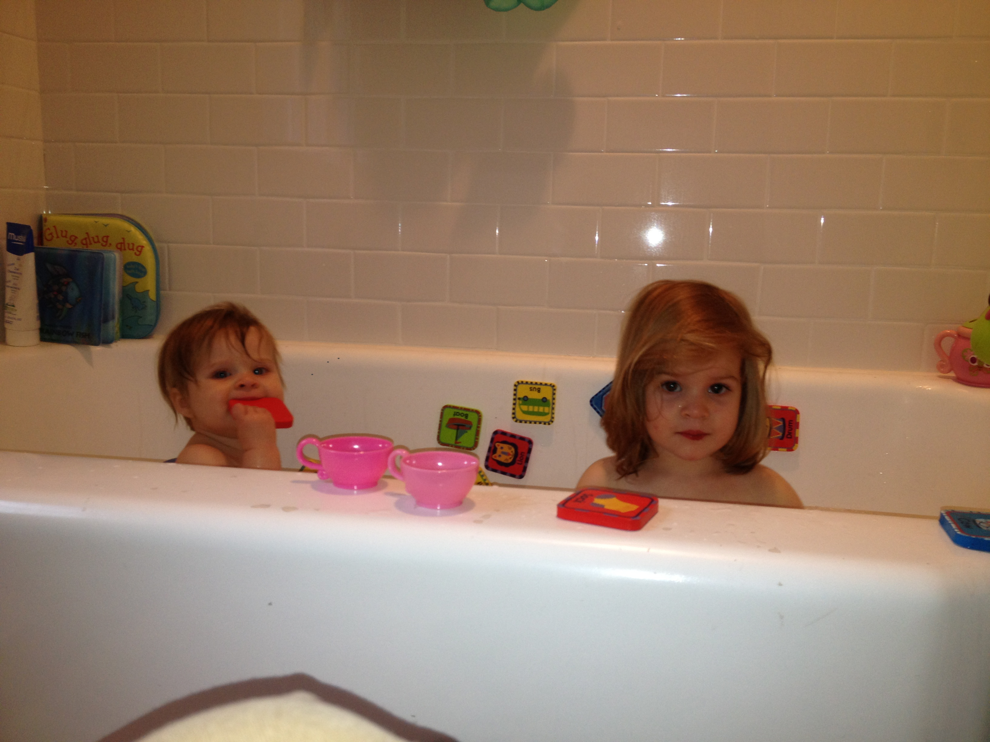 I believe I caught on video the first evidence of the girls playing together.  Phoebe was wound up after we got back from the playground and her excitement was contagious. Ellie can’t quite keep up with her but she tried her best.  Luckily the bath seemed to calm things down.  Afterward, Phoebe refused to brush her teeth so I denied her book reading and put her to bed and went downstairs to hydrate tyrone.  I realized when I was down there that the book reading is my favorite part of the day so in solid bad parent fashion I went back upstairs and got her out of the crib, convinced her to brush her teeth a bit and we read books as if our tiff had never happened.