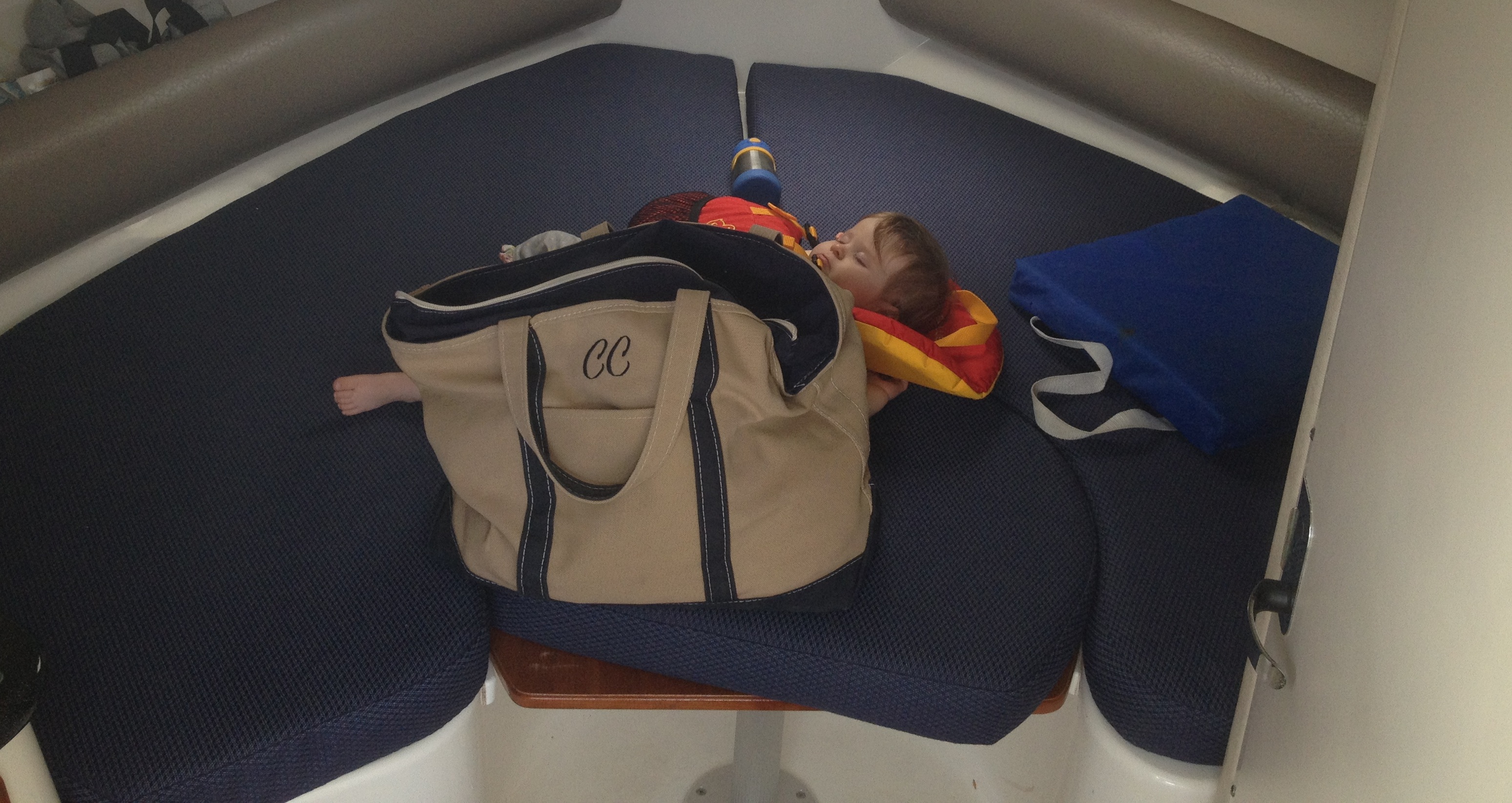Above: Lisa and Luke. The bench seat has proven to be a good choice. Below: Ellie is crashed out in her Canadian-approved but not U.S.-approved life jacket. Cristin setup a well-engineered system to keep her in place.