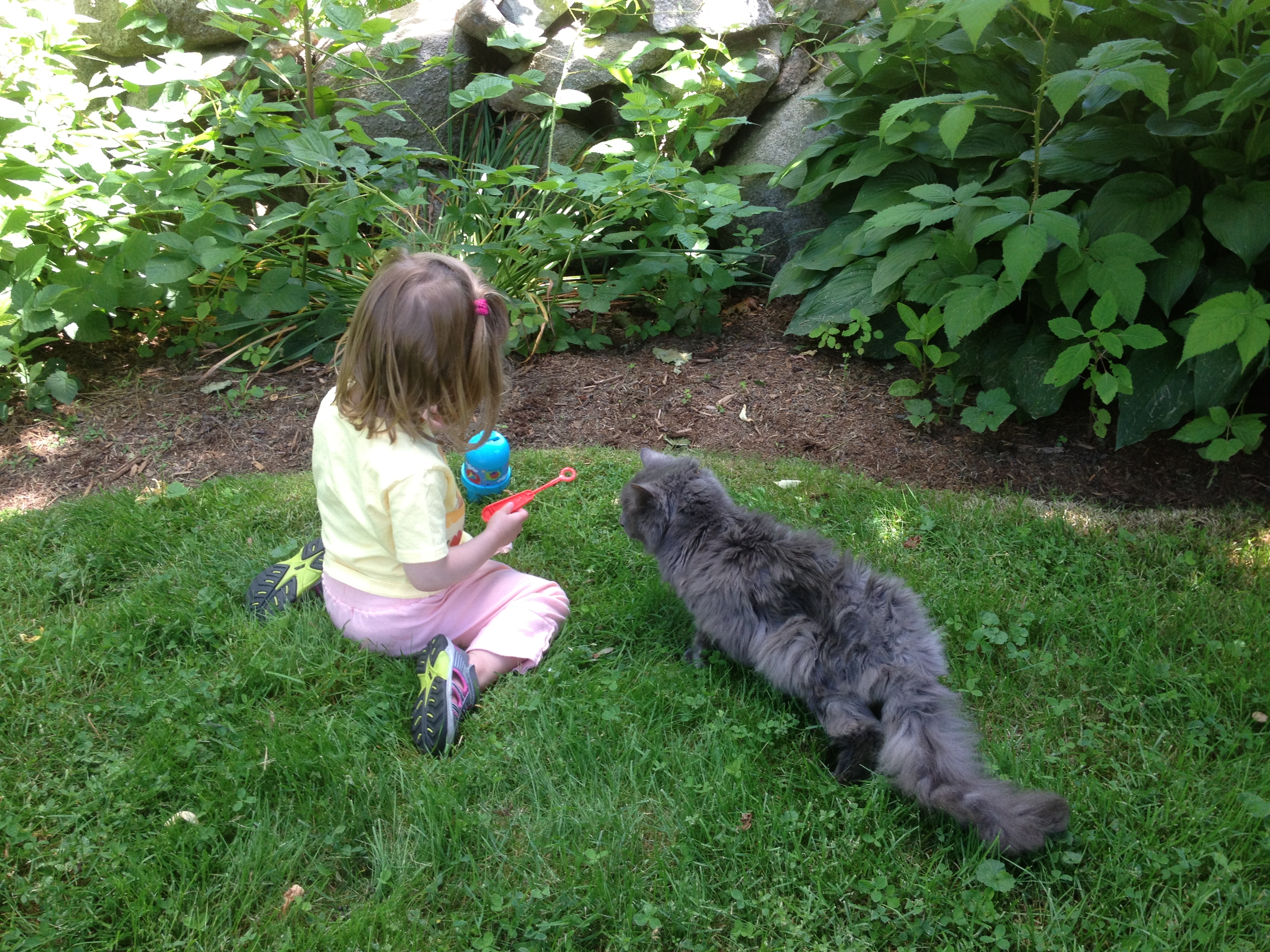Above: We are helping Tyrone get through his bucket list in whatever time he has left. He had always wanted to play bubbles with Phoebe. We are visiting the Reddi Whip factory tomorrow. Below: Phoebe was very affectionate today. She also managed to essentially snack away two meals. I am not sure if these events are related.