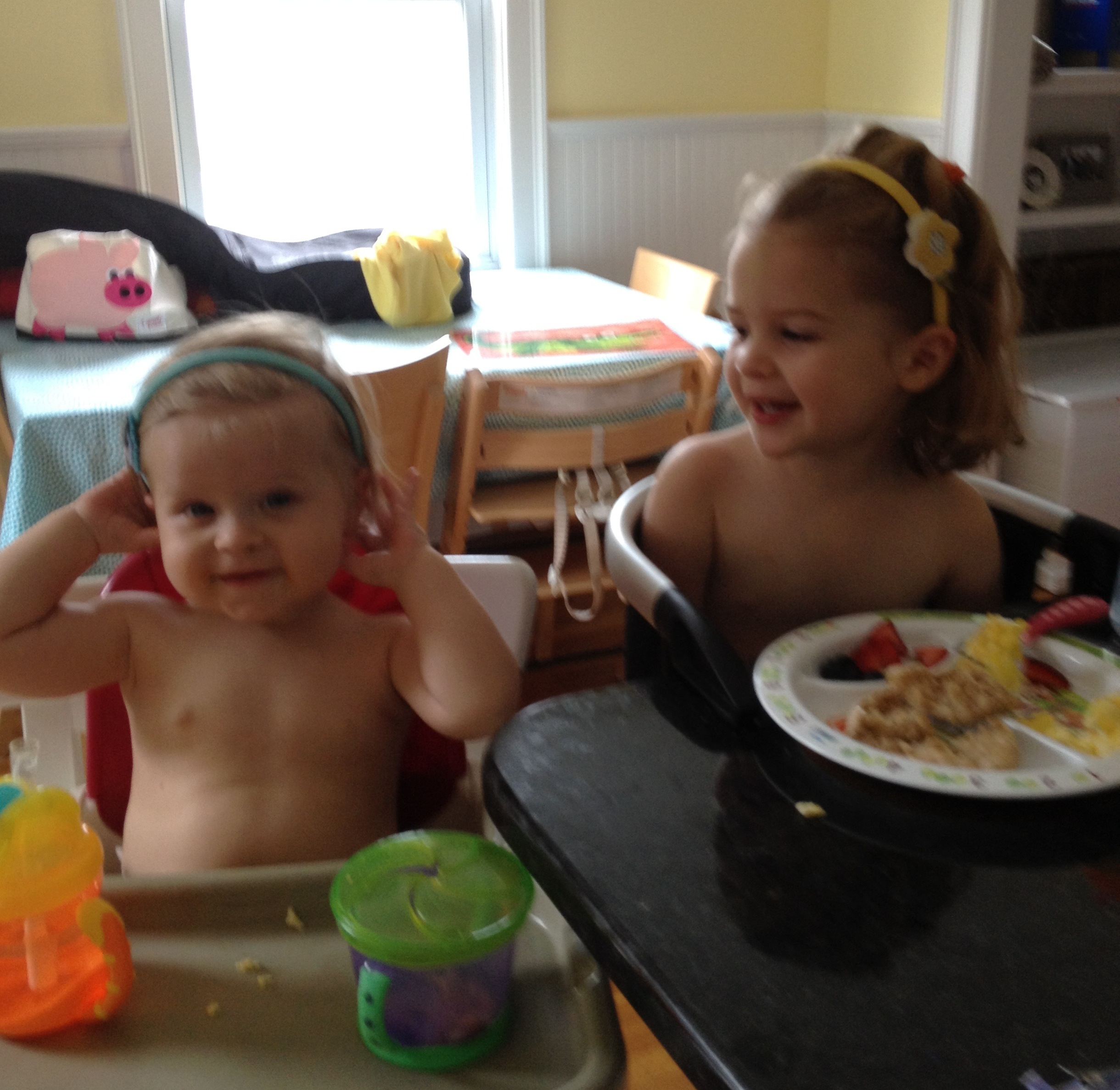 Yes, that is the title of the sappy book that Aunt Sarah gave us. Who wants to read something so depressing? I don’t know. Aunt Sarah apparently needs a constant injection of depressing during the summer when she doesn’t get to experience a continuous stream of sad narratives from her students. Speaking of growing up too fast, Phoebe moved to her “big girl bed” on saturday. Following a “headband breakfast”, Cristin took the ladies to Poppi and Tootsie’s house to give me time to convert over her crib which unfortunately entailed disassembling the cribs to swap them as Ellie’s crib came with the convertible section and there was zero chance that Geoff was driving to Ikea on tax free weekend to get the same piece for Phoebe’s. We had discussed tactics a bit with Aunt Sarah and Aunt Megan as my primary concern was that Phoebe would run around all night like a goblin. As you can see in the video, any hope that Phoebe would not be interested in getting on and off the bed herself was quickly vanquished. Thus far, however, she has waited for us to come get her. Fingers crossed.