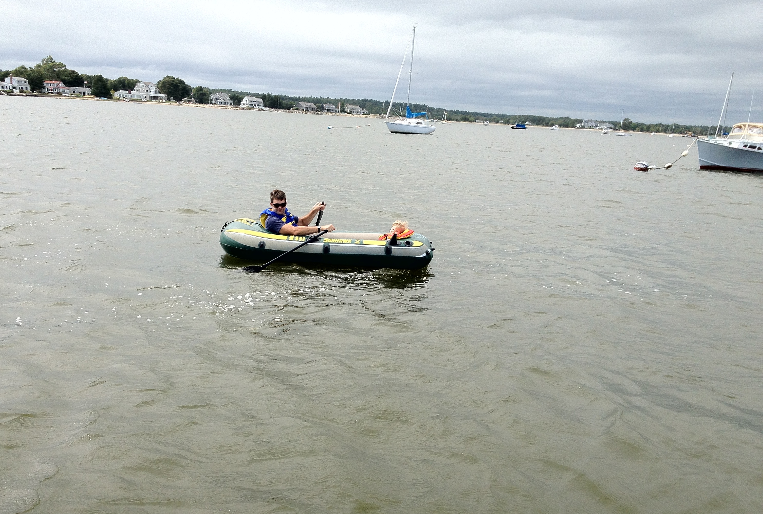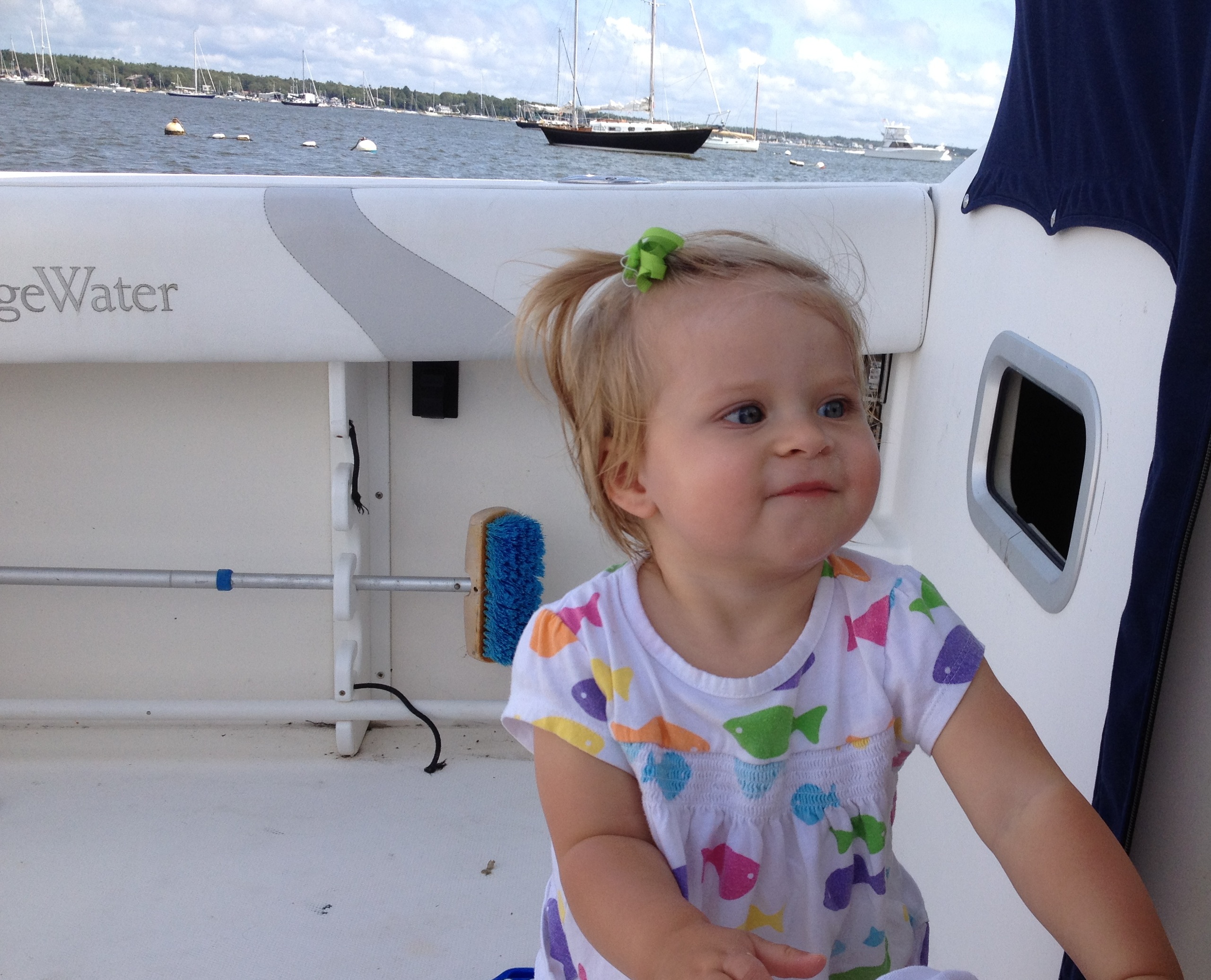 I have a hate/love relationship with september. The weather is perhaps the best of the entire year and I have probably had my best kiting days in this month with the water still warm but various fronts starting to come through. However, it marks the end of summer and beginning of fall and already I feel some depression. Sadly boating season is nearing an end.  I was hoping for 30 trips on the boat but we’ll end up somewhere between 25 and 30 which is ok.   We took the ladies out on saturday after Ellie’s birthday and there was a front coming and it was blowing pretty good right up the harbor.  We stayed on the sheltered side and I pumped up the inflatable and rowed Phoebe ashore.  I thought she would be interested in the crab carapaces strewn about but she was a bit disconcerted about how many there were.  I also showed her the fiddler crab holes and told her they were sleeping but this only seemed to put her more on edge. We paddled back and I took Ellie on a similar jaunt.  She was more interested in rowing at full speed and smashing into the out boat.  I finally had to put an end to that as I was getting tired and we were nearing naps and Cristin and I needed some work time.  When we got back to the mooring the swells were huge. This was partly from the squall and maybe partly from Isaac which was passing by at the time.   It took me a few tries to get the mooring.  We debated dropping everyone at the dock but the dock was fully immersed and rocking too much to be remotely safe.  We waited for the launch and he made at least a half dozen attempts to come alongside.  We were quite happy to be on board even though everybody quickly got soaked in the launch.  We next headed out to pick up two guests off of a Pearson sailboat.  A man got off first and quickly huddled in the corner of the launch and a woman, likely his wife, got off second.  He made no move to help her which I thought was strange considering the passage between boats was a bit tenuous.  We were then informed that he was completely seasick and she was on her way. There were no goodbyes or anything, nobody said a word.  I wonder what happened on that boat.