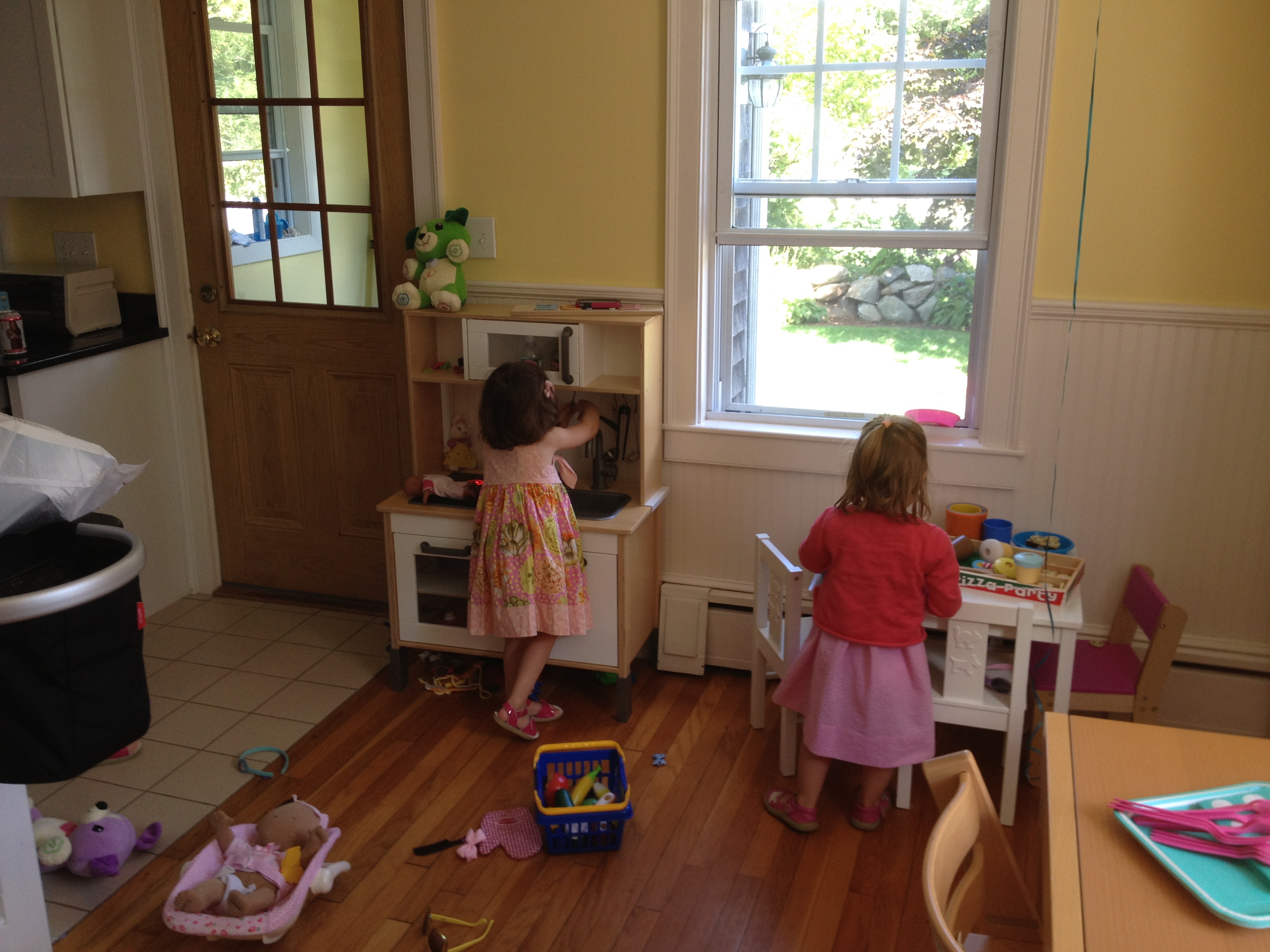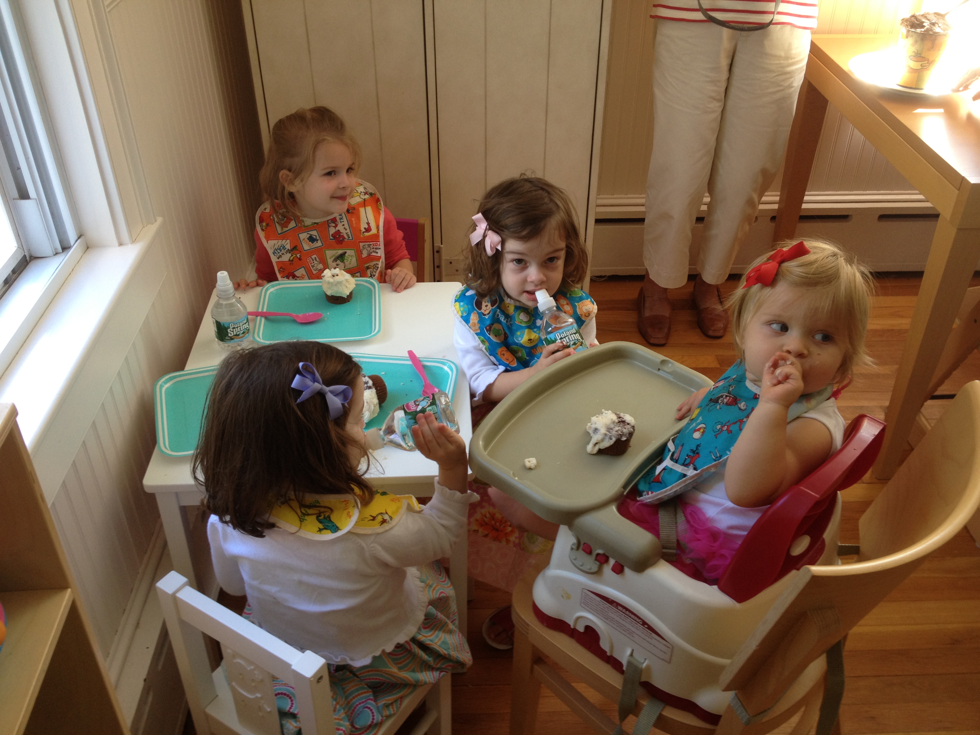 Above: The ladies eat their cupcakes. The icing at least. Below: Phoebe and Olivia made food for everyone. At some point they discovered they could pour water from their water bottles into tupperware cups. They would then do shots of the water or on occasion bring it into the adult area and dump it on somebody.