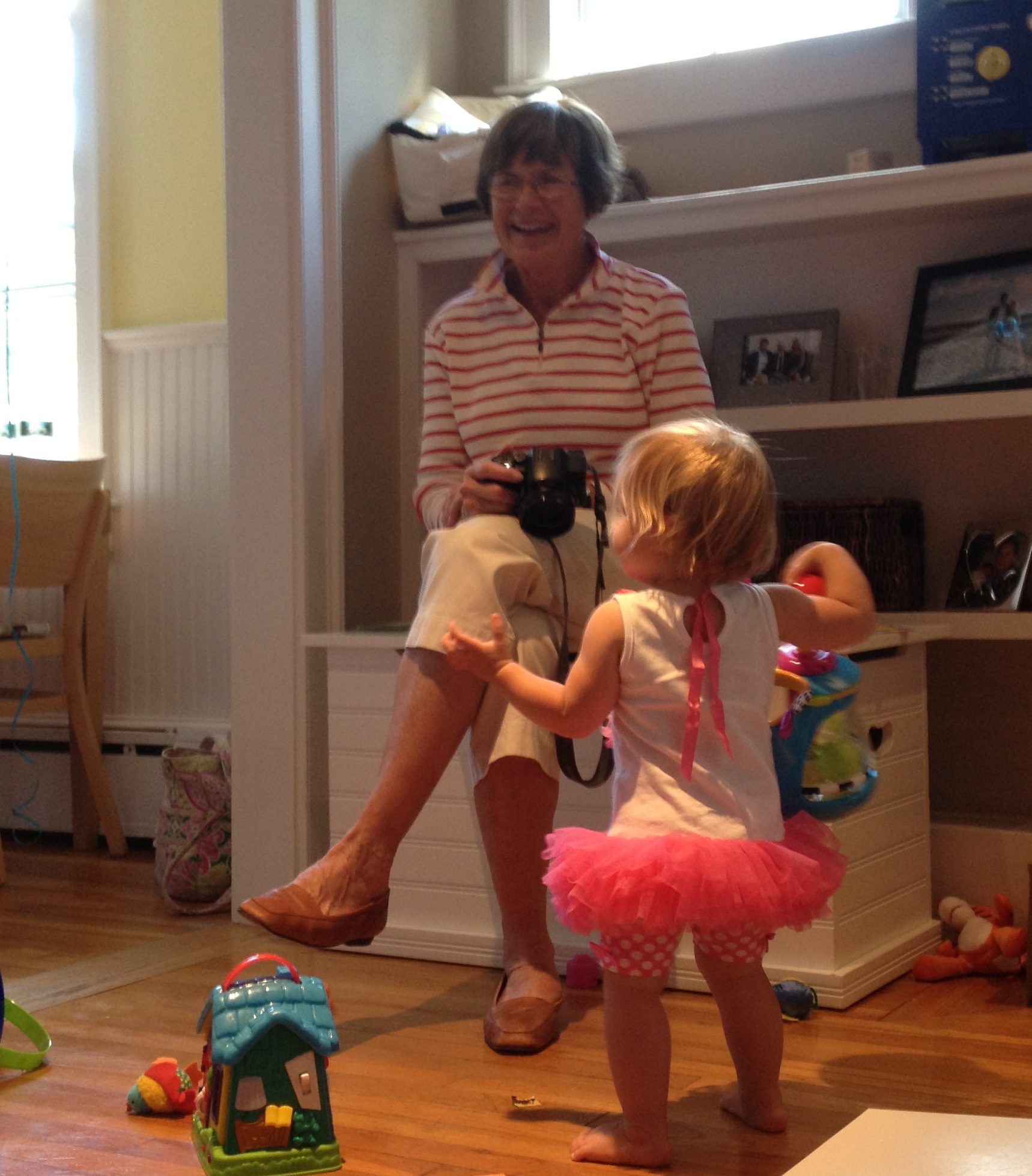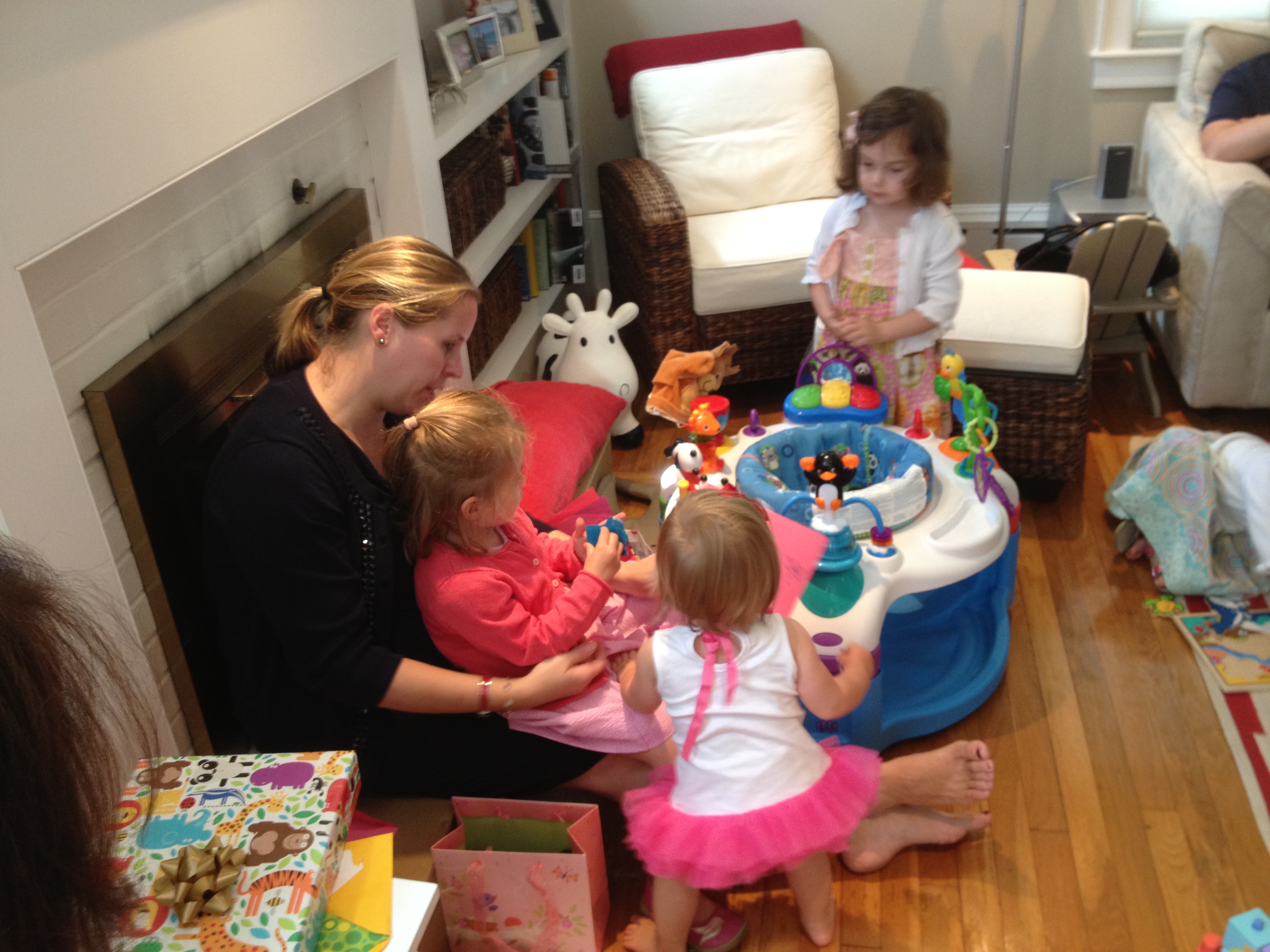 Above; Phoebe helps Ellie open gifts while Olivia monitors. Below: Ellie can walk. For some reason it requires that she be carrying something. As long as it is carried below the center of mass this makes sense to me.