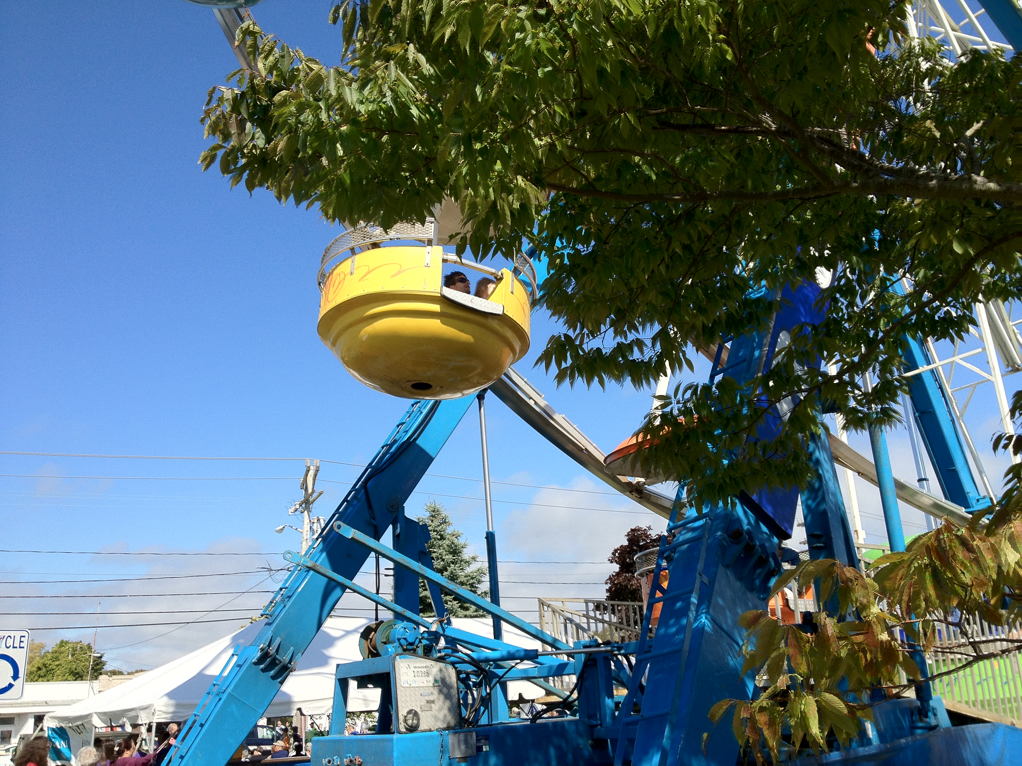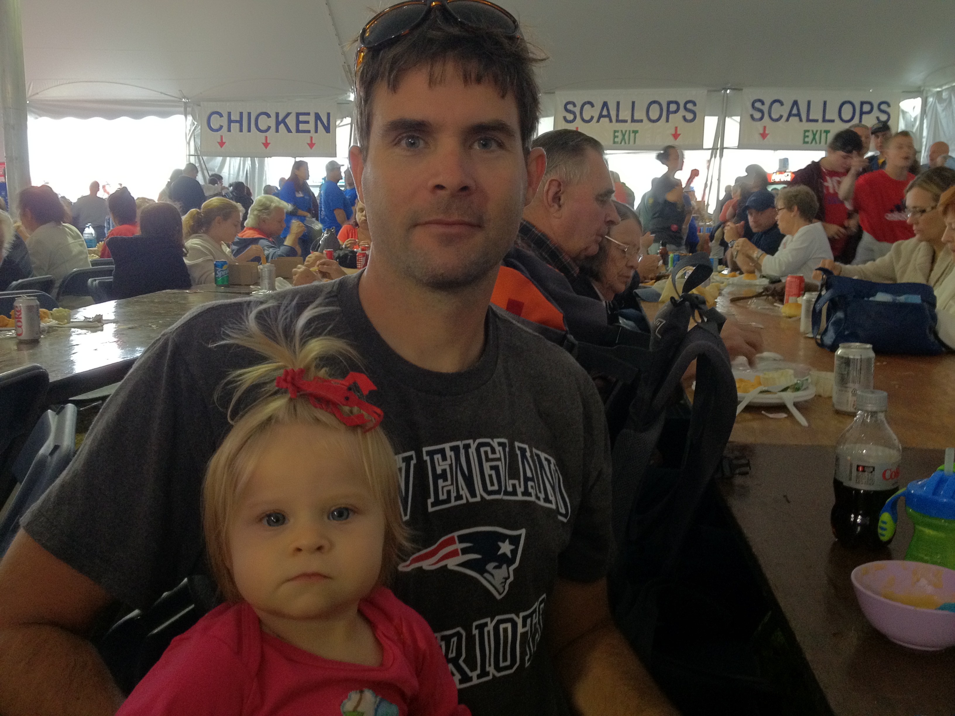 I have always seen signs for the Bourne Scallop Festival but have never gone. I never understood what it was all about. Turns out it is more than scallops. They also have clams. Upon arrival we went into an enormous tent and my nose were inundated with the smell of fried. We shirked the long lines to the frialators and chose landlubber fare. After that we went out to try out some of the rides. Phoebe was in a good mood and wanted to try out everything but had her eye on the ferris wheel the entire time. It was a decent sized wheel and all I have to do is look at something like that and my acrophobia kicks in. I don’t know what the different levels of that are but mine is definitely towards the worst end of the spectrum. How I found myself trapped in a tiny basket in a hot air balloon with two burly men miles above the french countryside for two hours is a long story which basically boils down to one important point: I am an idiot. Also, it didn’t do anything in the way of “curing” me so the phobia persists. I had Ellie in the backpack so Cristin took her on whatever rides she was qualified to go on which were any where the line was under 42″. She was set on going on the ferris wheel so we waited in line where she picked the color car she wanted. The ferris wheel is an incredibly inefficient ride because it can only load one car at a time and the ride is not really running while they unload/load the entire wheel. They loaded us last and I knew right away what this meant. The ride was nice and Phoebe sat still which was good because there was very little in the way of a rail. A toddler standing on the seat could fall over the edge without any problem at all. We had a nice view of the train bridge and the canal and maritime academy. Finally the ride ended and they began unloading which meant we did one full rotation over about a ten minute period. This meant we spent what felt like an eternity nearly stationary at the top during which Phoebe became untenable. I was very relieved to get back on the ground.