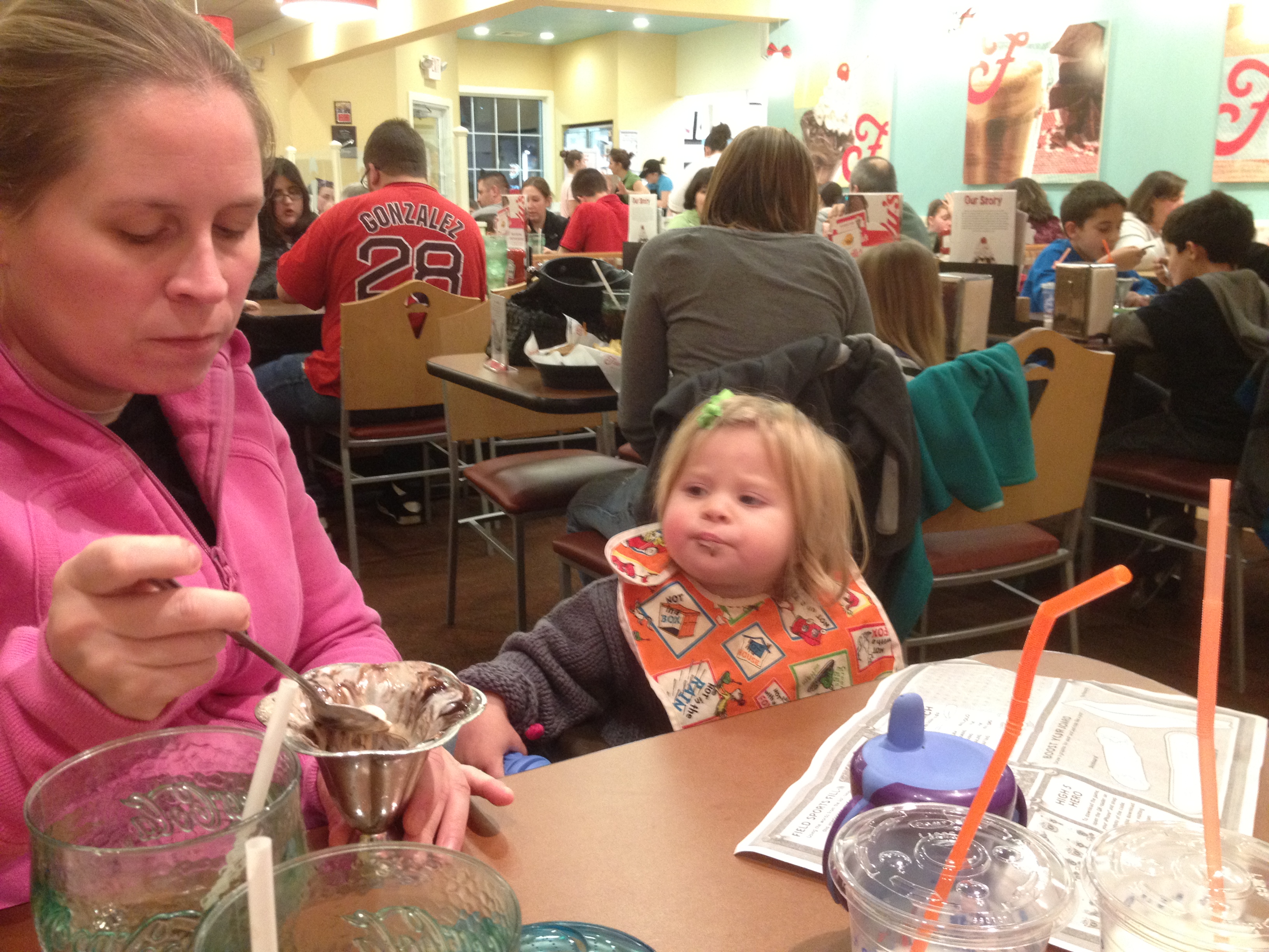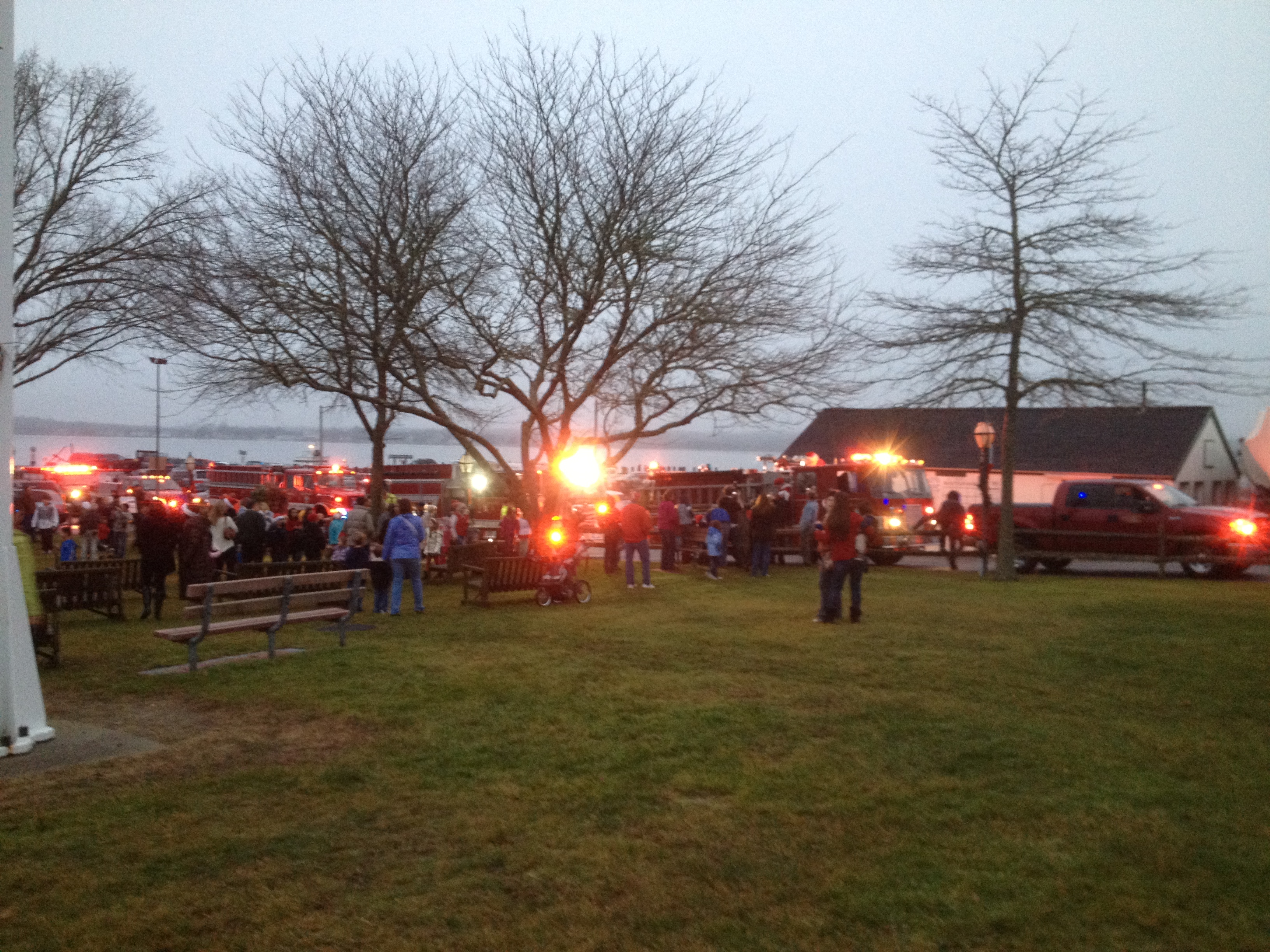 For the second year running we attended the Mattapoisett tree lighting ceremony. Santa was scheduled to arrive at 4:15 which is mid-nap for the kids and we found ourselves with less than 15 minutes to pull the children from their beds, use the potty, get dressed, use the potty again and drive down to the wharf in time for his arrival on the fire truck. With sirens blaring there was no chance Phoebe was going anywhere near this man or Mrs. Claus but she did get the courage up to hug frosty and rudolph and eventually danced with both of them near the tree. The tree lighting faced delay until an electrician was found who could tap into the electric line which carried the juice from the locked harbormaster’s office where the actual switch apparently lives. Even though the forecast was a bit gloomy, it was a beautiful night in the mid 50’s and with the bandstand, the wharf, and the historic houses along water street all lit up with candles, it was quite stunning. We capped off the evening with a trip to friendly’s where Phoebe followed up dinner with some plastic penguin sundae that can be washed and converted into a savings bank. I once thought that the possibilities of what can be made out of plastic are limitless but this thing is a sign that we are reaching the end. We were supposed to split the dessert but I found myself out in the car dealing with an Ellie blowout and upon return found that Phoebe had not held up her end of the bargain.