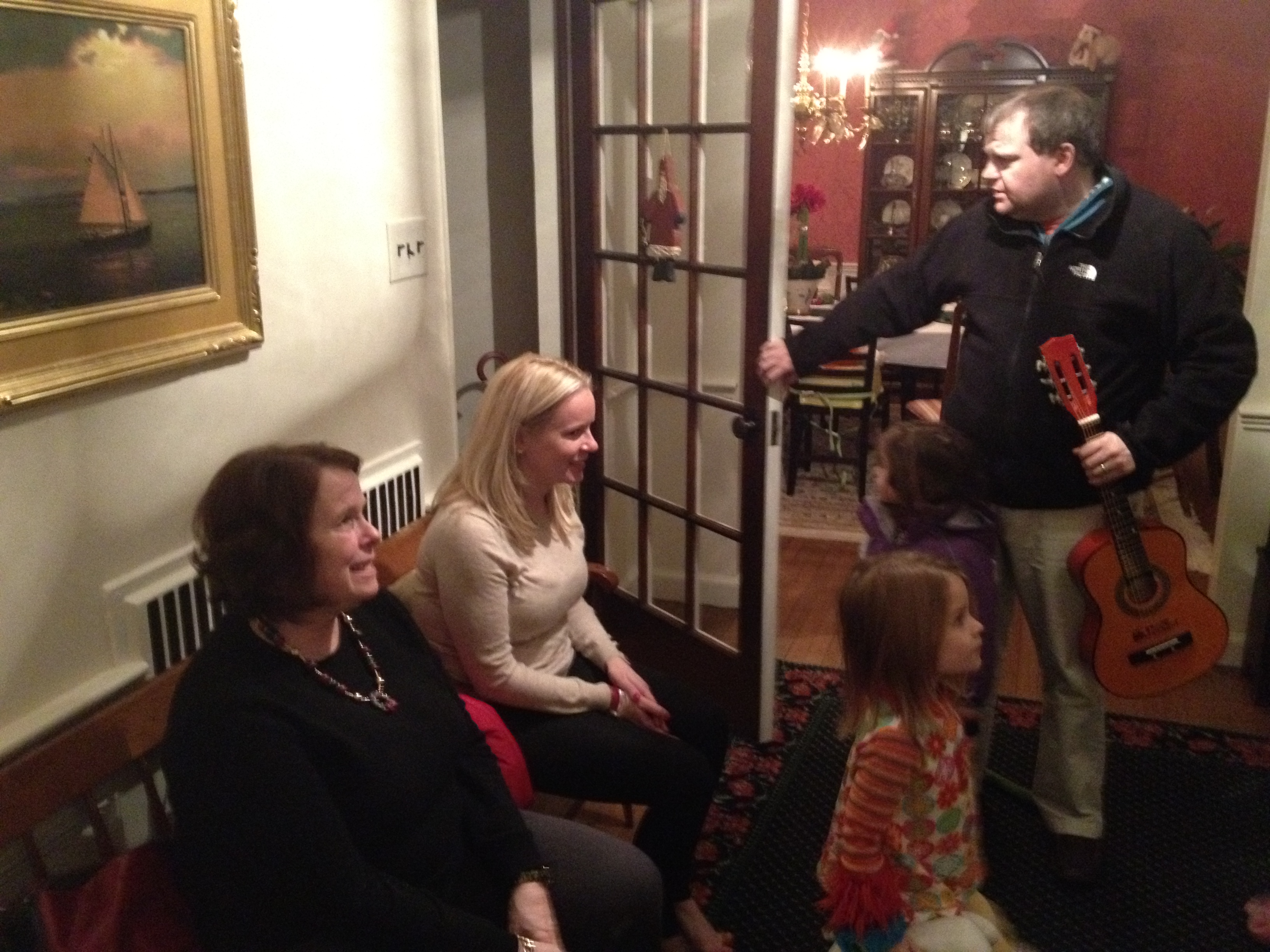 Christmas Day Eve we took the ladies to Poppi and Tootsie’s for more presents. Ellie hadn’t napped in the morning or in the car trip up so I ended up walking her around the Hills while the cousins opened gifts. Poppi and Tootsie gave Phoebe a very cool magnetic construction set which has, for the moment, taken the place of train play at bed time. Lindsay and Olivia showed up with the christmas presents that Santa had brought: a guitar and a trumpet. Santa is a sadist for sure.