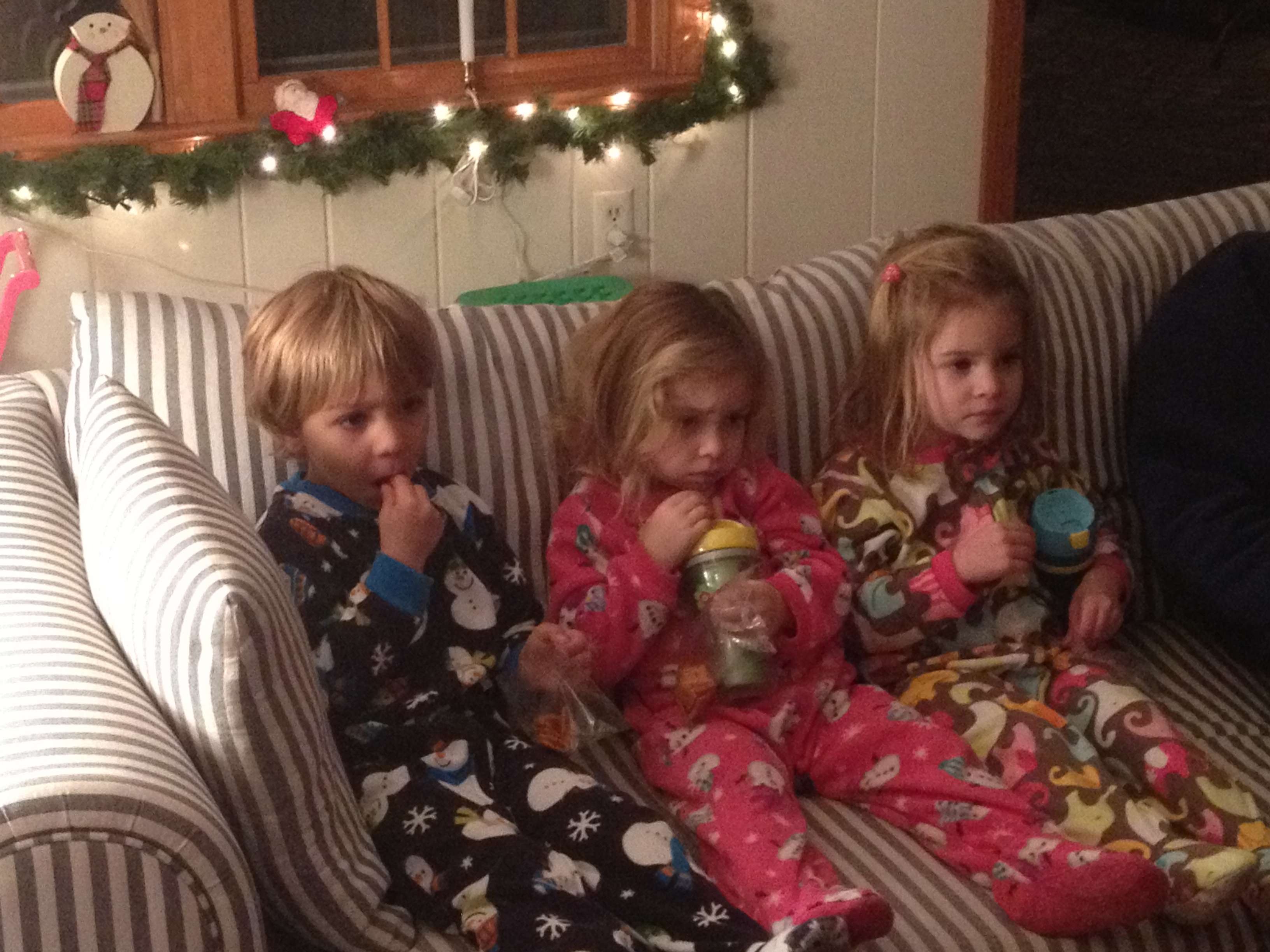 Above: Phoebe considers the circus to be a rather intense experience. Below: the post-bath snackathon. Almost complete silence beyond the strange laugh of curious george and the asynchronous crunching of pretzels.