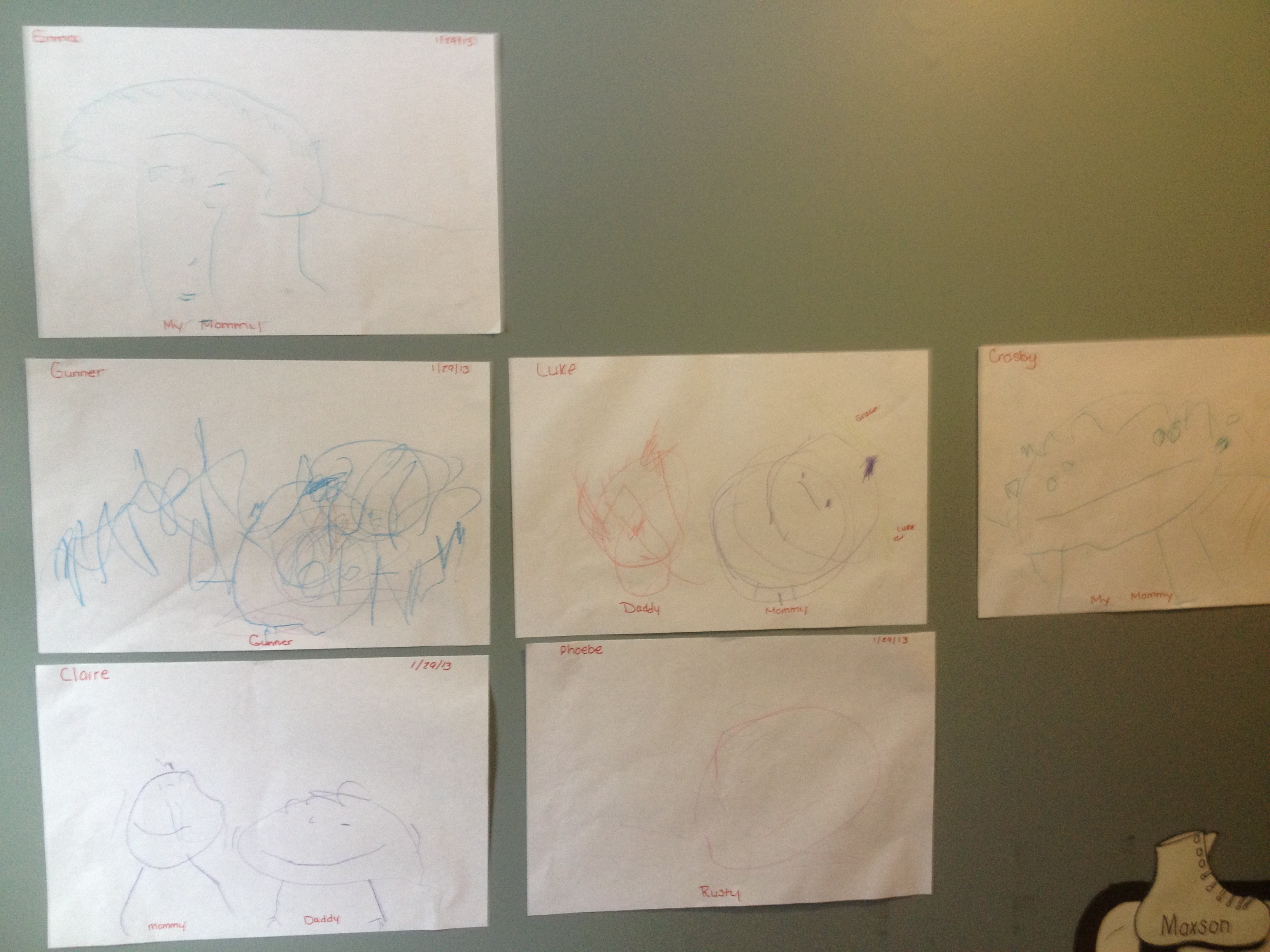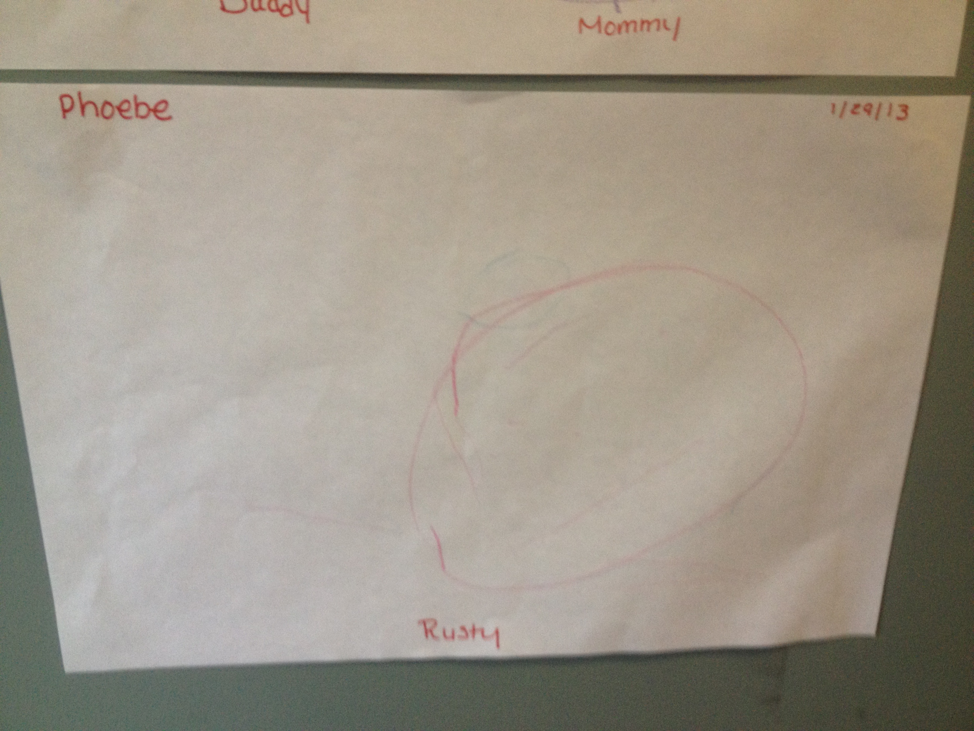 Above: Art assignment: Draw pictures of your family. Below: Phoebe’s family: Rusty (Frosty)