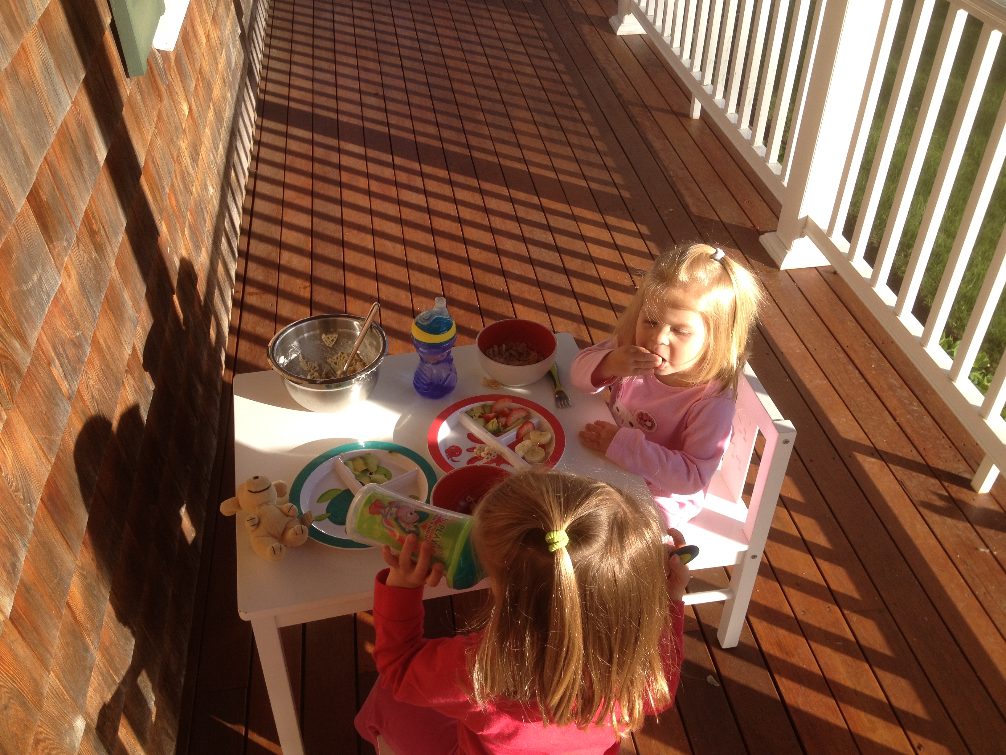 Daddy days are more fun and more exhausting than ever. Cristin has been getting home late for reasons that I could explain here but I prefer that people stay awake for the remainder of the post. I have about an hour window in the morning to shower and get the girls up and dressed and fed and make Phoebe’s lunch and take her to school. The evening is the more hectic time as I try to pack in dinner for the ladies, a trip to the playground and making dinner for Cristin and myself before the sun goes down. The girls have been eating on the porch recently which has been very pleasant. I have decided that I like this time of year the best. It is warm enough for t-shirts but not too hot or muggy and the mosquitoes have yet to show up. Cristin took Phoebe shopping and engaging her in the process has expanded her interest in foods. Ellie continues to eat mostly everything we give her with the exception of raisins which she will chew for a minute or two and subsequently disgorge. Their current favorite is some kind of rice based pasta that Cristin found at the local organic store. The pasta itself is dreadful, basically it tastes like chewy brown rice. However it comes in many shapes and the girls will consume it to the point where they quarrel over the last piece. Last night we returned home from the playground after a car ride filled with Phoebe’s concern of something she had discovered during the trip. Upon arrival I demanded to know what had caused my headache and she handed me a strange white blob. I asked her where she had found it and she replied, “In my nose”. Great. Later that evening, the girls were doing their usual couch gymnastics and Ellie fell and stood up holding her mouth. I was worried she had bashed her knee into her face, something she has a tendency to do, and then she held out her hand and in it was a small white item. My heart leapt as I imagined it to be a tooth (which would have been associated with blood) and I took it from her and discovered that it was not a tooth but rather a significant chunk of the pasta we had for dinner, half of a soccer ball to be precise. It was completely undigested. It must have somehow been lodged in her mouth for 90 minutes. After baths I put Ellie to bed and then read to Phoebe and headed down to bike in the basement with the video monitors. Last night entailed five trips upstairs to get Phoebe to go to sleep. First trip was to use the potty which was a reasonable request and something I had overlooked. Trip two was prompted by a “something is bothering me” distress call through the monitor which prompted a change of underpants to ones with a less scratchy tag. Trip three and four were related to the fact that her pajamas are too small for her. On trip three I tried to address excess shin exposure by pulling them down at the waist. On trip four I tried to address excess bum exposure resulting from my modification on trip three. Finally, on trip five which was prompted by a false potty call I shut her down and found an hour of peace in the basement.