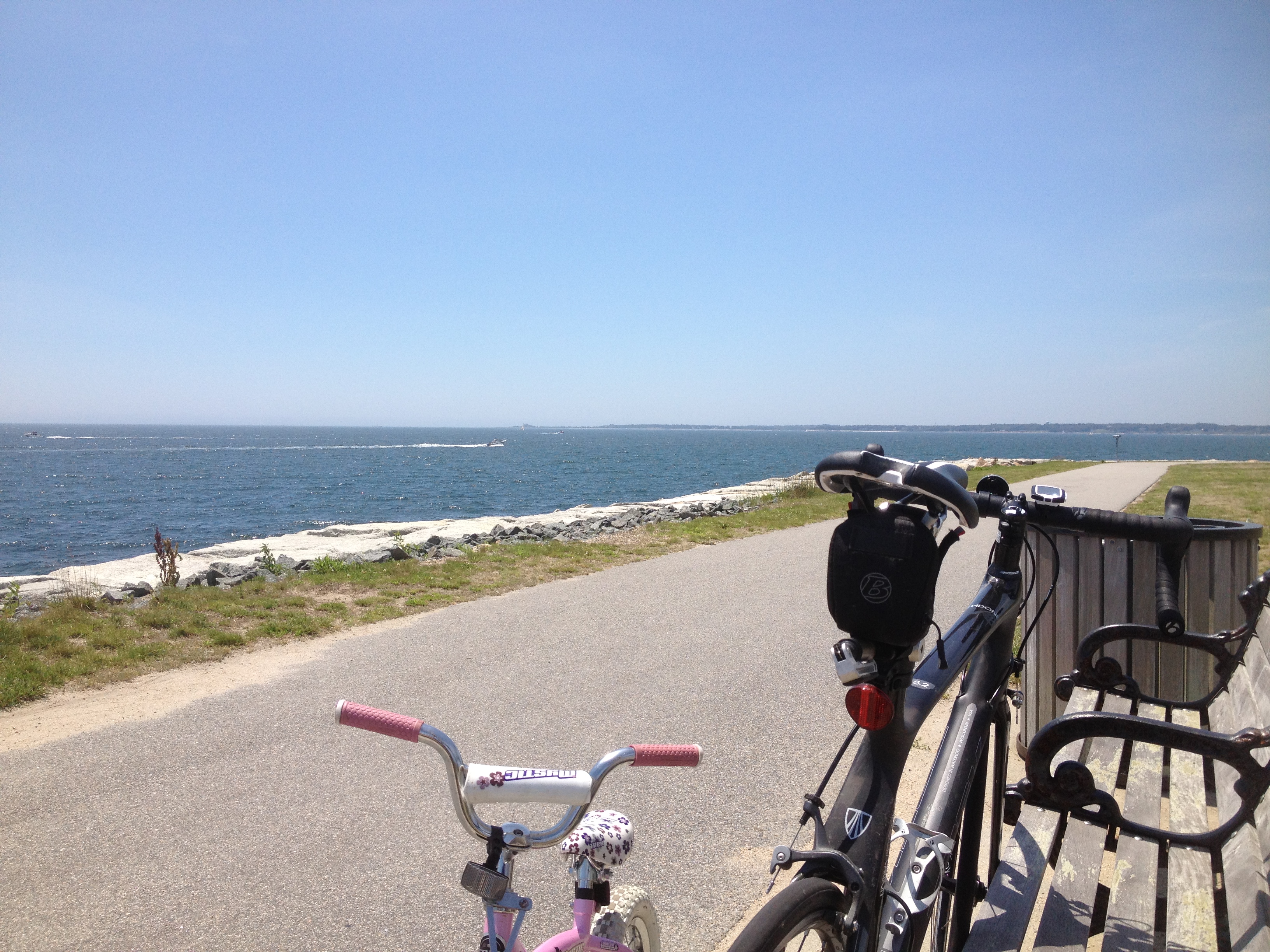Ellie’s illness had wiped out our weekend and triggered cancellation of plans on saturday and sunday including time with the Moore’s. In raw evidence of my high level of self centerdness, I became visibly angry that I was not going to get to see Andy and crew because my toddler was spiking a high fever and vomiting all over Cristin. As the morning wore on, I was tired of only exhaling to keep positive pressure in my lungs at all time so I took Phoebe to Fort Rodman in the afternoon to go biking. We had previously had some discussion about going someplace else to bike other than our street a few months ago and this was on her list of priority thoughts so when I asked her if she wanted to bike in the Lane she got very upset. She is clearly not ready for streets with traffic or the bike path so on a friend’s suggestion we went to Fort Rodman in New Bedford. Also known as Fort Taber for reasons that nobody seems to be able to explain, Ford Rodman is a civil war era fort on a peninsula that juts out into Buzzard’s Bay, one of the most beautiful spots around. This area also features the Miliken Battery, a World War II era bunker and military installation that now serves as a shelter for teens to conduct their sketchy activities. It is completely dilapidad but removing that amount of concrete is near impossible so it has become part of the landscape. Other features of the peninsula include my workplace (SMAST) and the local water treatment plant – good planning New Bedford!!!. New Bedford has a strong history of destroying good waterfront real estate with (1) heavy-metal producing factories, (2) power plants, (3) waste water treatment plants, and (4) a two-mile, three-story high pile of rocks known as the Hurricane Barrier which has “saved more money than it cost” in some kind of overly simplistic economic analysis. New Bedford is reclaiming its waterfront and in my time working here I have seen dramatic improvements including connecting the working waterfront with the incredibly well preserved historical section. Enough about New Bedford. I had a great time with Phoebe and she rode the full path in blistering heat and other than both of us verbally misidentifying the gender of a individual seated near us when we stopped for snacks, the ride went without a hitch. When we got back to SMAST we headed in to cool off and look at the animals in the wetlab for the fifth time and set out for home. I had brought her scooter to keep her entertained while I packed up and put the bike on the roof and she decided she wanted to scooter back to the Fort. I like to push these kids but was a bit hesitant about this given the heat. She convinced me and I reapplied lotion and we headed out, me on foot. She can scooter faster than I can walk but slower than I can jog so I found it a bit awkward to keep up with her and ended up drenched in sweat.