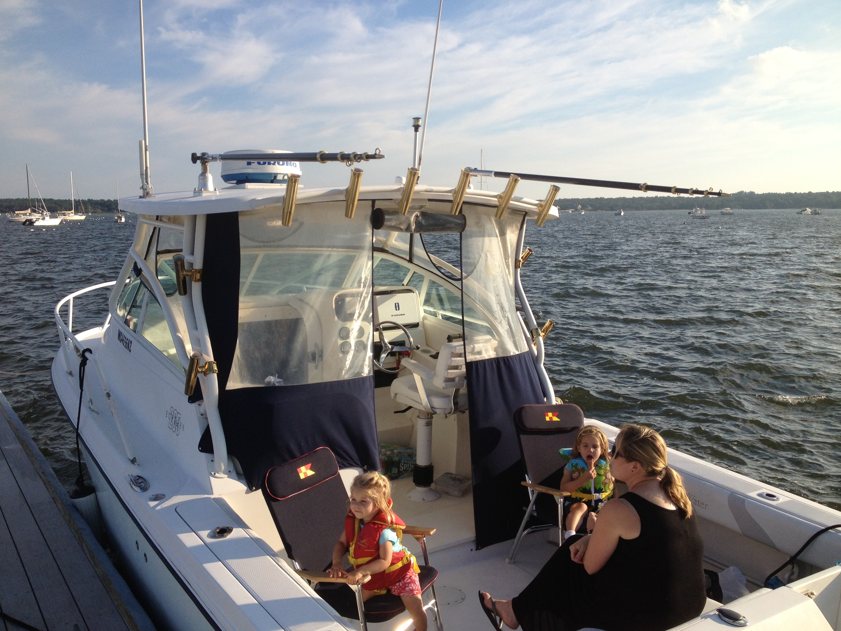 A drizzly saturday morning put a delay on the boat plans so we started browsing the web for other activities.  I remembered a place in nearby Acushnet with bumper boats so we headed over there with the bike on the car so I could ride home.   The place was quite eclectic and appeared to be a dairy farm that had been partially converted over to amusement park.  Some of the farm elements were still in place such as the low lighting and large walk-in freezers.  As the drizzle had cancelled the outdoor fun there were just a few additional families there, all attending a birthday party in a “room” within the interior amusement area created using walls built from milk crates.  As eclectic as this place is, the employees could not have been more accommodating.  They worked Phoebe and Ellie into the birthday party activities and went way out of their way to make sure everybody was having a good time.  My favorite moment there was watching Ellie and Phoebe play the world’s slowest air hockey game.      When everybody was home we rode bikes and then got pizza and took it out to the boat.  We made the mistake of getting a “family size” pizza which has interior pieces with no crust that tend to be quite flimsy.    We had just enough time to squeeze in ice cream so we took the boat over to the town docks.   I showered with the ladies – in my bathing suit to avoid further interrogation – and headed to work.  A good day.
