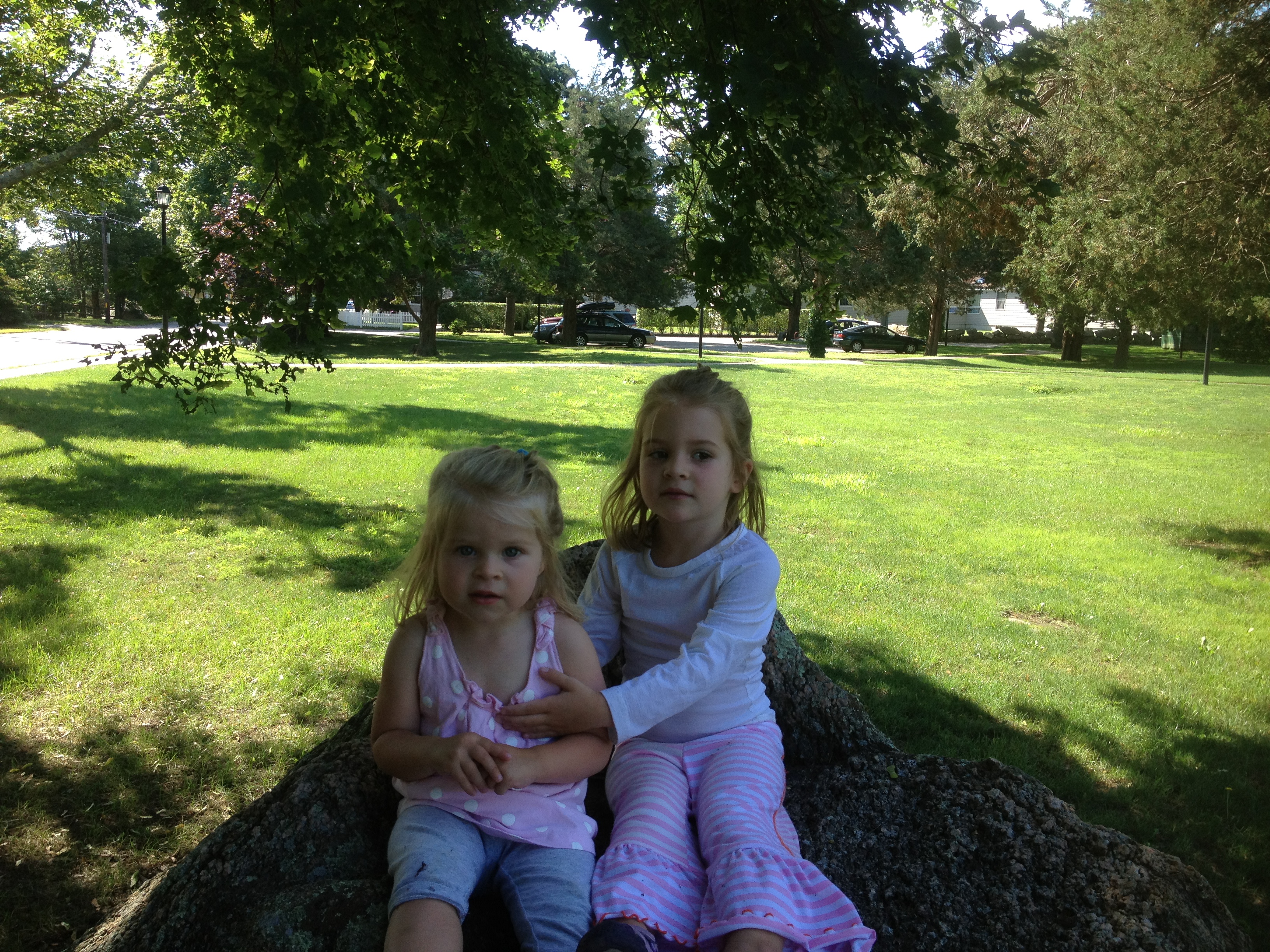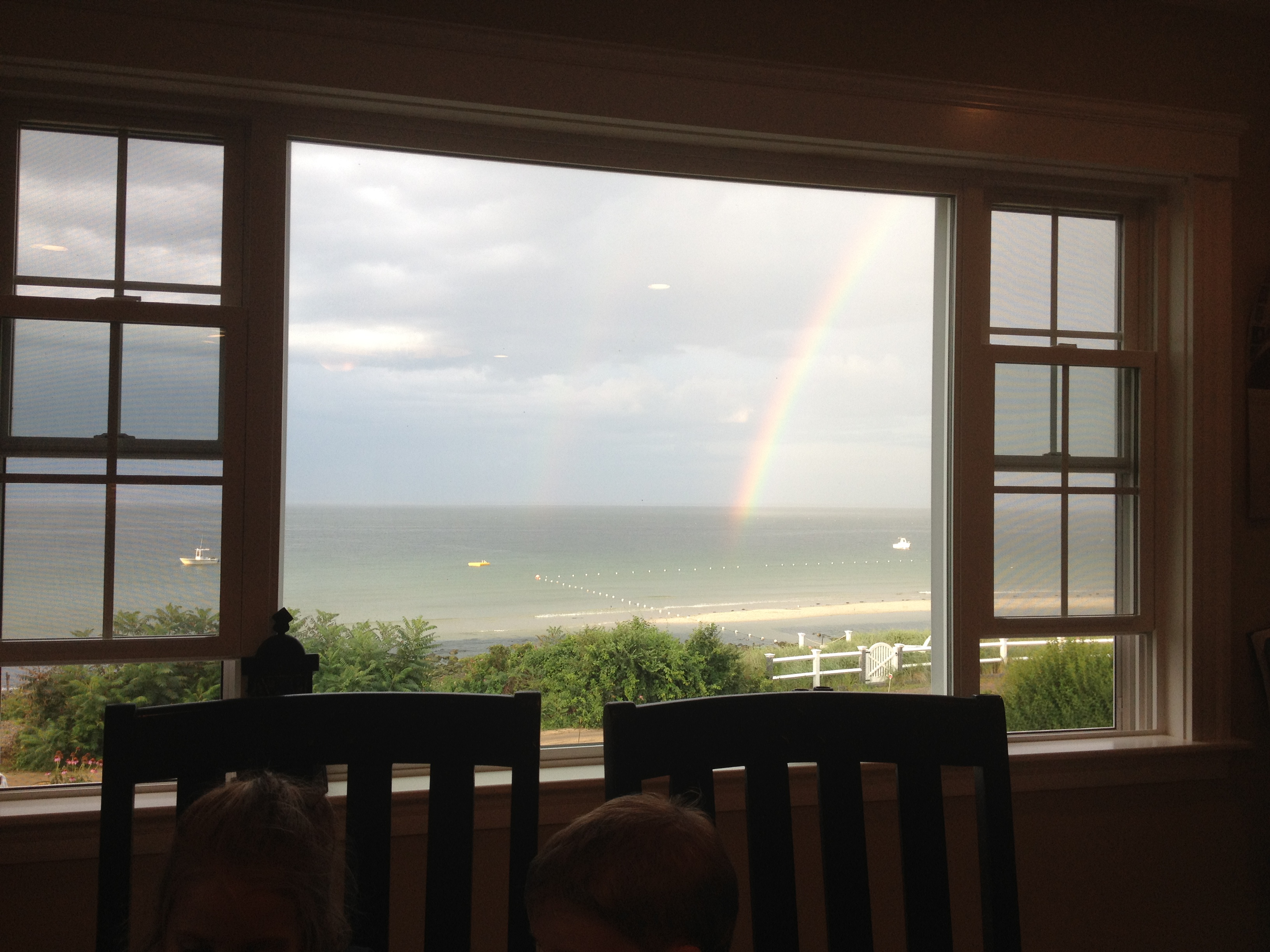 Cristin was stressing about some thing which I won’t describe here because I can’t. Not for reasons of confidentiality but rather ignorance. I took the girls to Uncle Jon’s for breakfast and we ate outside and eavesdropped on a couple planning a trip to Maine. We were considering joining them until we realized they were taking the Harley. We then headed to Tabor to climb in their boulder garden. Phoebe loves climbing rocks and Ellie was actually putting some effort into it today. The fun ended abruptly on the very last rock when Phoebe reached to overturn a small rock that was sitting in a moss covered crack on the top of the rock and about 100 earwigs scattered beneath her in pure panic. I removed her from the rock quickly so that she would not to disturb any future trips to the rock garden with memories of panicked bugs. When I got home, Cristin felt relieved having quickly wikipediated herself to expert level in some new topic and and we packed and headed out to the boat and went to our favorite spot on a sadly neglected mooring in Marion. I took the girls for a row and Ellie ate the entirety of Cristin’s tuna lunch. I was planning on a big bike ride later in the day so I packed a lot to eat including a sandwich made with natural peanut butter. The taste was ok but the smell was quite odd. I will stick with Skippy for the near future. When we got home I got on my bike and left Cristin to pack and organize the kids for the trip to the Velema’s in Plymouth. I had mulled over the route options a bit but in the end I chose well. There is a large chunk of southeastern Mass bordered by routes 3 and 25 and 58 that largely empty, containing mostly rolling roads through bogs and Miles Standish state park. The park roads were pretty bad but outside the park the roads were paved and completely empty. After crossing rt. 3, the massive alarm towers signaled that I was nearing Pilgrim nuclear and I reached the Velema’s after about two hours of riding and way too much distance ridden with my phone in my hand trying to figure out where I was. Their house sits on a bluff overlooking Cape Cod Bay and the views from their living room and kitchen are extraordinary. The kids were anxious to hit the beach so we walked down the stairs with a random collection of toys and watched them play until a freak rain cloud scattered everybody and left behind an extraordinarily brilliant rainbow that arced right across the Bay and appeared to end in Provincetown. We had a great dinner with ice cream on the porch and then headed home.