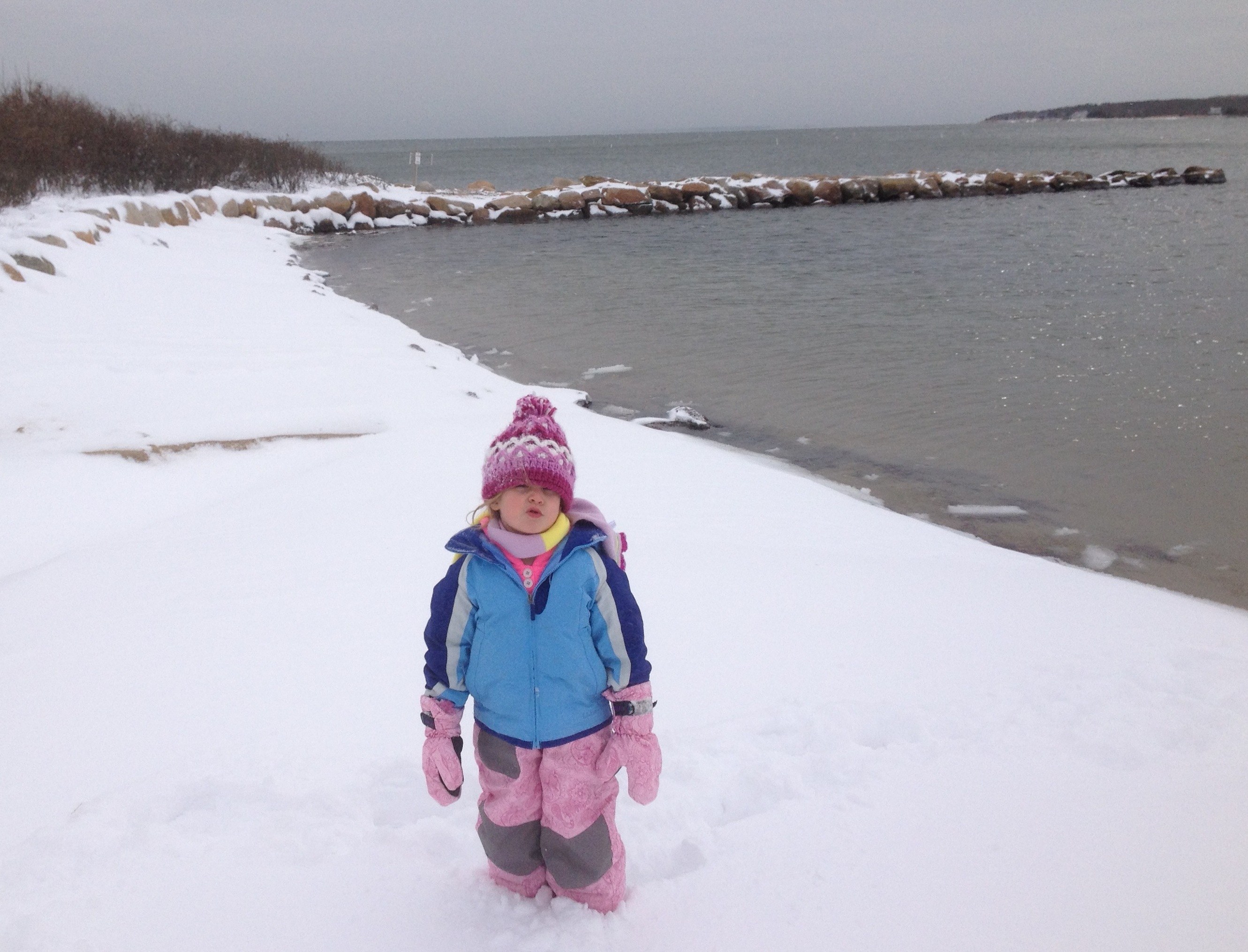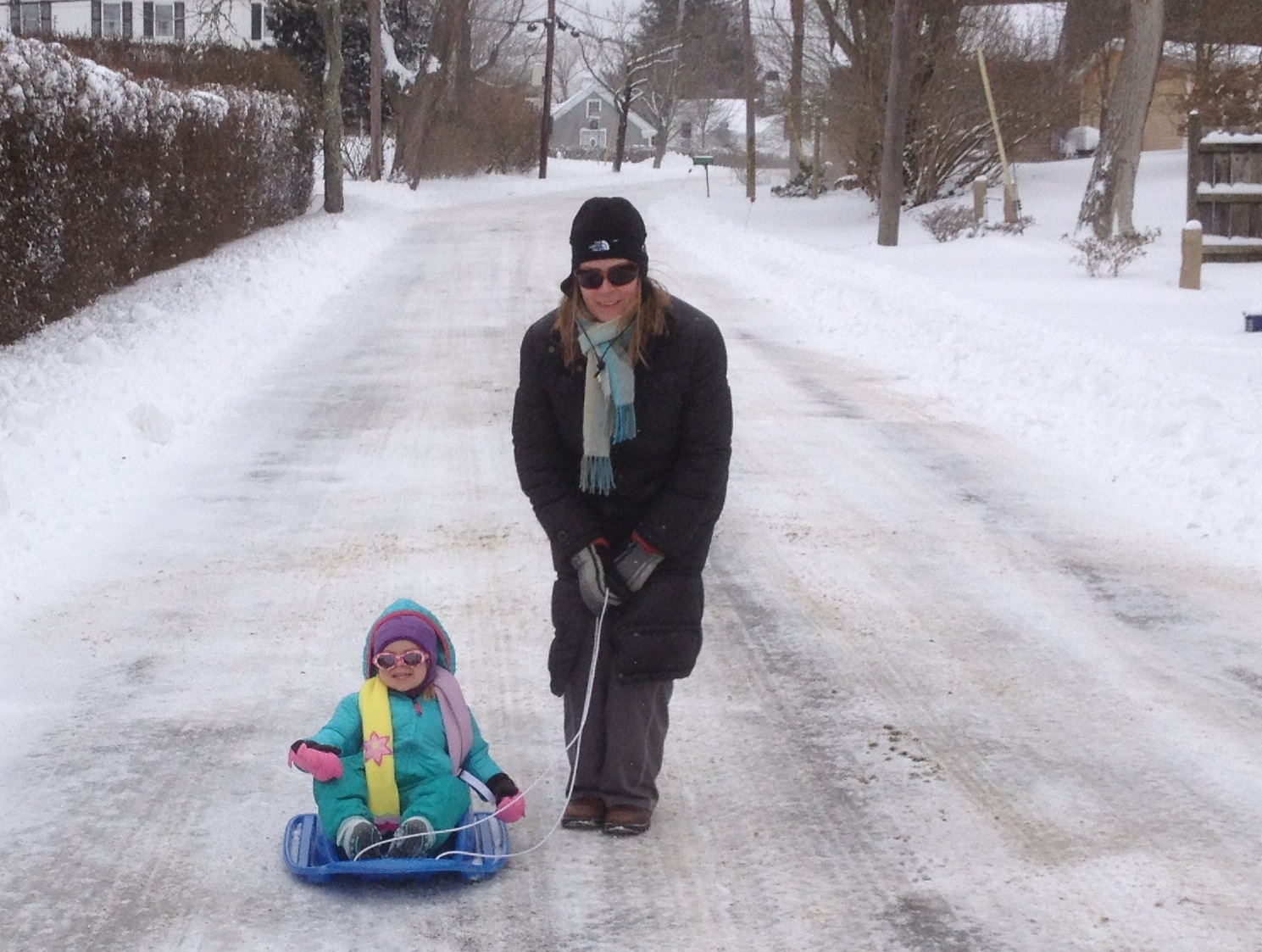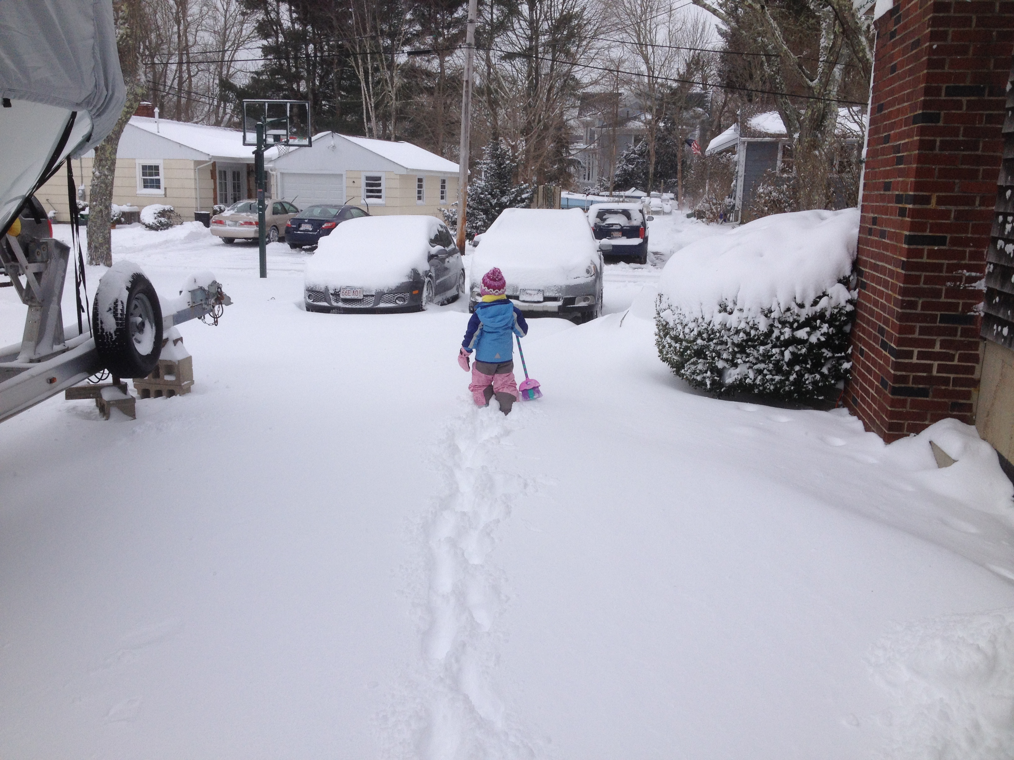 In this day and age it is hard to avoid news and the weather and yet somehow Cristin and I continue to do so to our detriment. As I was looking for tupperware storage in Target on monday I overheard a couple talking about the difference in snowfall between two forecasting models. Later that day we discovered they were referring to a storm (Chester) that was due the following day that was going to affect much of the eastern seaboard. It began late tuesday and the time between Cristin’s text of “leaving work” and her arrival in the driveway was 4 hours. That meant that she was able to hear the entirety of the Stern Show rebroadcast in addition to another hour or so of terrible music. Wednesday I woke and looked out the window and saw the neighbors kids out shoveling. The temperature read 9F with “feels like” temps around -10 due to the wind. Nothing like northern New England but enough to prompt me to find and wear a hat. The neighbor kids are pretty hardy and I later found out that there was some financial incentive. I had no incentive to shovel other than getting some exercise and relieving the anxiety from my ever growing OCD about such matters. Phoebe came out to “help” which was fun. By help I mean repeatedly strike the side of the boat with her plastic broom. When I queried her actions, she explained she was “brushing off the cars”. Seemed reasonable to me. After shoveling I came in and rallied everybody to go back out again on the sleds and was met with resistance across the board. They relinquished and we towed the ladies down to the beach to watch an amusingly helpless Ellie try to move about on foot. She is generally pretty lazy and snow deeper than her ankles causes her level of effort to fall to absolute zero. When we got back I raced them down Baker Lane on their sleds which was fun enough that they stopped complaining about the cold and eventually I had to make the call to end the fresh air experience when I noticed their cheeks were becoming unusually rosy.