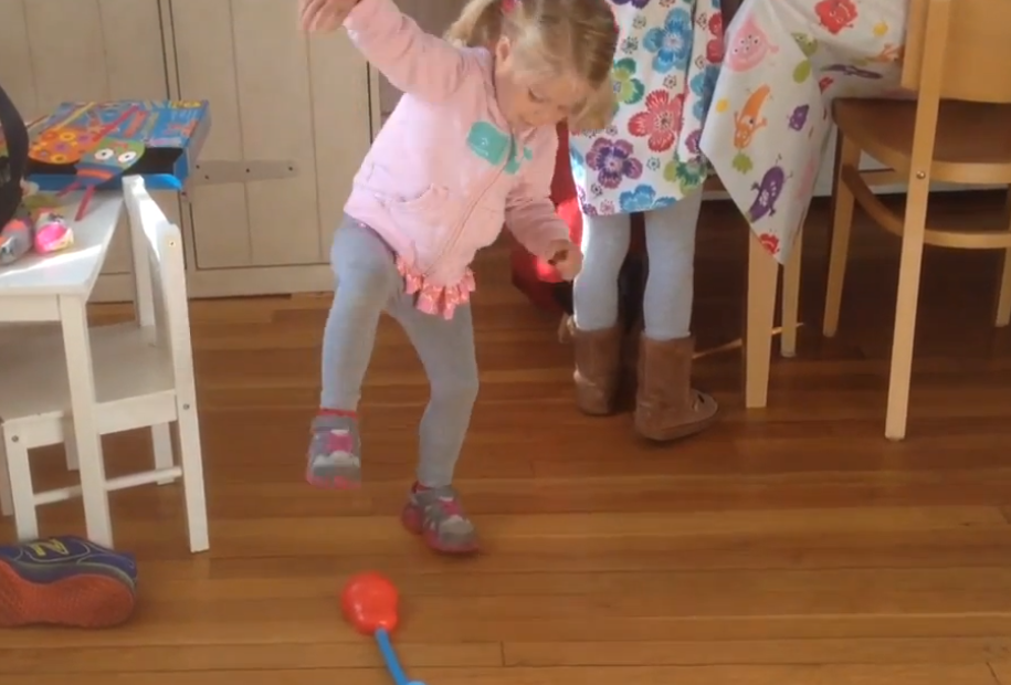 Combine a doctor’s appointment with mommy time and what do you get? Shopping!! Following Phoebe’s 4th Bday checkup, Cristin bought a bunch of stuff from our local toy shop. There was some reasoning behind some of the purchases involving Disney and guilt but I couldn’t quite get what she was saying. The ultimate result was more plastic figurines and a sweet rocket launch kit. I couldn’t wait to play with it myself so I opened the box after the girls were in bed but I was duly punished when I failed to put the rockets away which essentially killed any chance of a good breakfast before school. Any anomaly in the kitchen landscape is immediately spotted by Phoebe. Stomp Rockets are a cool toy that actually works without batteries but not everything you need is included, such as a 20′ ladder.
