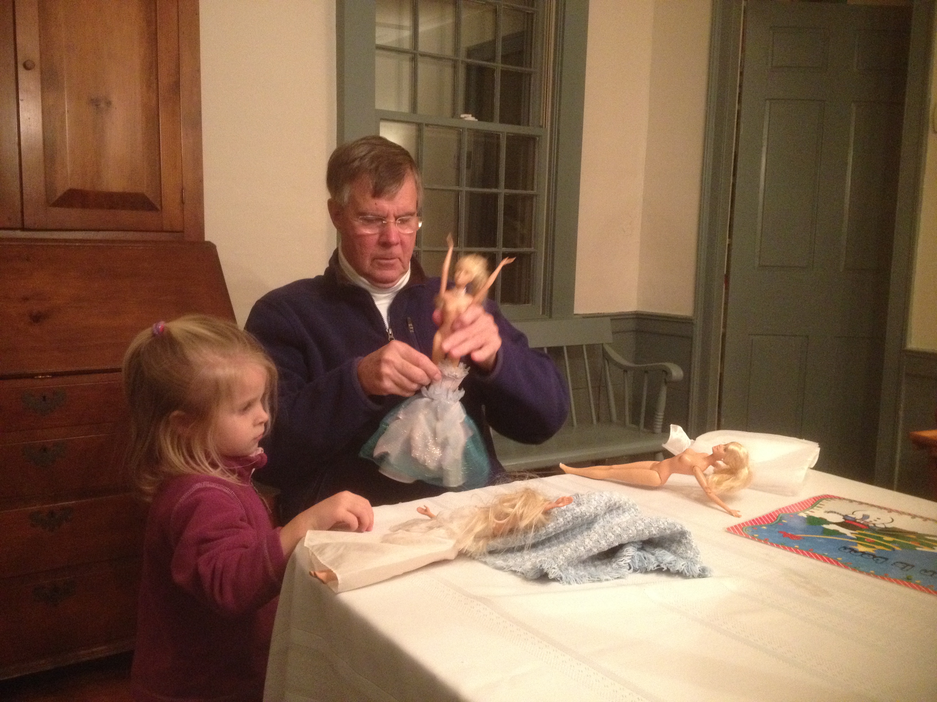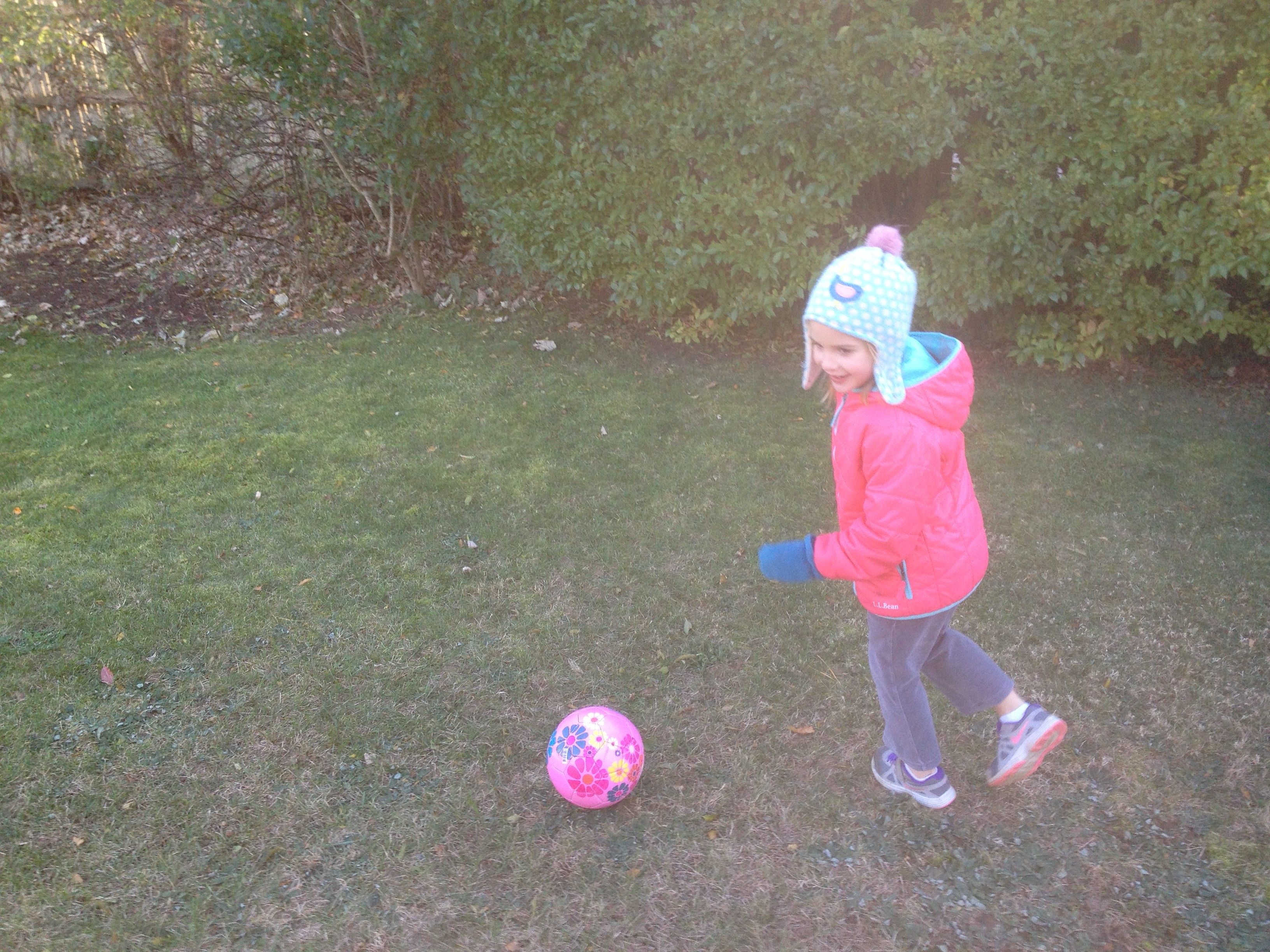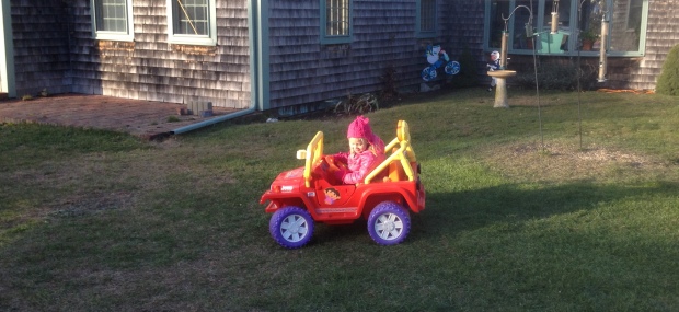 Another weekend, another patent crisis. I placed a call to Gaga and headed to work Saturday morning while Cristin took the girls to gymnastics. I met them there and off we went to Chatham. The kids don’t appreciate how close we live to their grandparents but the exercise of counting the exits on the mid-Cape seems to pass the time. I am sure my parents did the same thing with Sarah and myself. The girls would probably would be happier if we lived further away because Chatham is too short a trip for the DVD players. It was a bit of a blustery day but I had packed winter stuff and we spent as much time as we could in the yard. Ellie took the wheel of the jeep and needed no help maneuvering it around, a stark contrast to previous visits where I was constantly pulling her out of the bushes. Phoebe seemed a bit put off by Ellie’s domination of the Jeep but got into a soccer game with Puppa and quickly forgot about it. After outside time, Gaga made them hot chocolate and we had macaroni twist and a quick shower and headed home. They were both asleep by the time I hit the mid-Cape. A solid day.