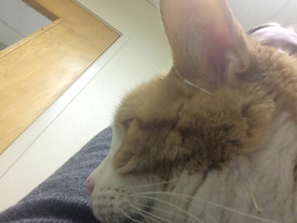 I note this because Bugs now suffers from an idiopathic vestibular disorder.  Essentially some part of the system used to maintain balance and perceive and predict motion has malfunctioned.  The source of the problem is either the amazing 3-axis accelerometers on the lateral sides of his skull or in the portion of of his nervous system that processes input from these and other sensors (eyes, ears).  Whatever it is, his body is sensing constant acceleration where there is none, not dissimilar to when you get the spins after getting a bit too tipsy.  He has really adjusted well. His spontaneous vestibular-ocular reflex has all but disappeared and he has methods for getting down the stairs and onto the bed.  He no longer jumps up or down but otherwise is doing well.  Our vet tested for everything he could and we decided to forgo dragging him to Angell for a PET scan.  The vet finally suggested, with a bit of hesitation, acupuncture.  He said he had seen improvement in previous cases after a few rounds. Cristin took him in and he had a session followed by laser light therapy (also used to regrow hair, cure carpal tunnel, and help people to quit smoking). When Bugs came home Cristin concluded that he had greatly improved from the session.  I was not completely convinced but found myself agreeing there were some positive changes.  Perhaps Bugs was simply determined to appear as if he was better so that we would never take him back to the vet to get stabbed in the head with tiny needles and shot at with lasers.  If this was his strategy, then it failed because he went back for his second session today with two more to go.  We don’t have a control cat so we will never know if it is really working but I have decided to believe that it is, well the acupuncture is, the laser light therapy is a total sham.