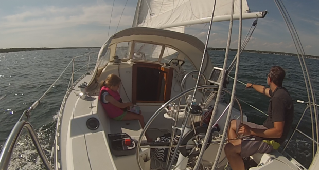 A perfect summer day. Last night (Friday) I got pizza on the way home and we went for a quick sail but did not have enough time to get anywhere. This morning I got up early enough so we could do some biking and get on the boat with more time to spare. Ellie has outgrown her 12″ bike which we had purchased for Phoebe on Ebay some time ago. It is hard for her to to get any speed going due to the tiny cranks. At some point recently I remembered we had another 16″ bike given to us by our neighbors from Baker Lane and we found it in the shed and cleaned it up with windex. I think the girls used half of a bottle on it so it should stay shiny for some time. Ellie fits better on this bike and is now able to outpace me on my scooter. We went for a ride into town so she could really stretch her legs and I think it frustrated Phoebe a bit that Ellie can almost keep up with her. Phoebe can stand push the pedals so she maintains some advantage on the hills. However, Ellie is not afraid of just hammering the legs down indefinitely and she impressed me by climbing Church St. back to the house without needing to stop or requesting a push.